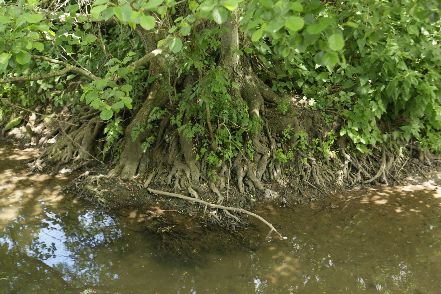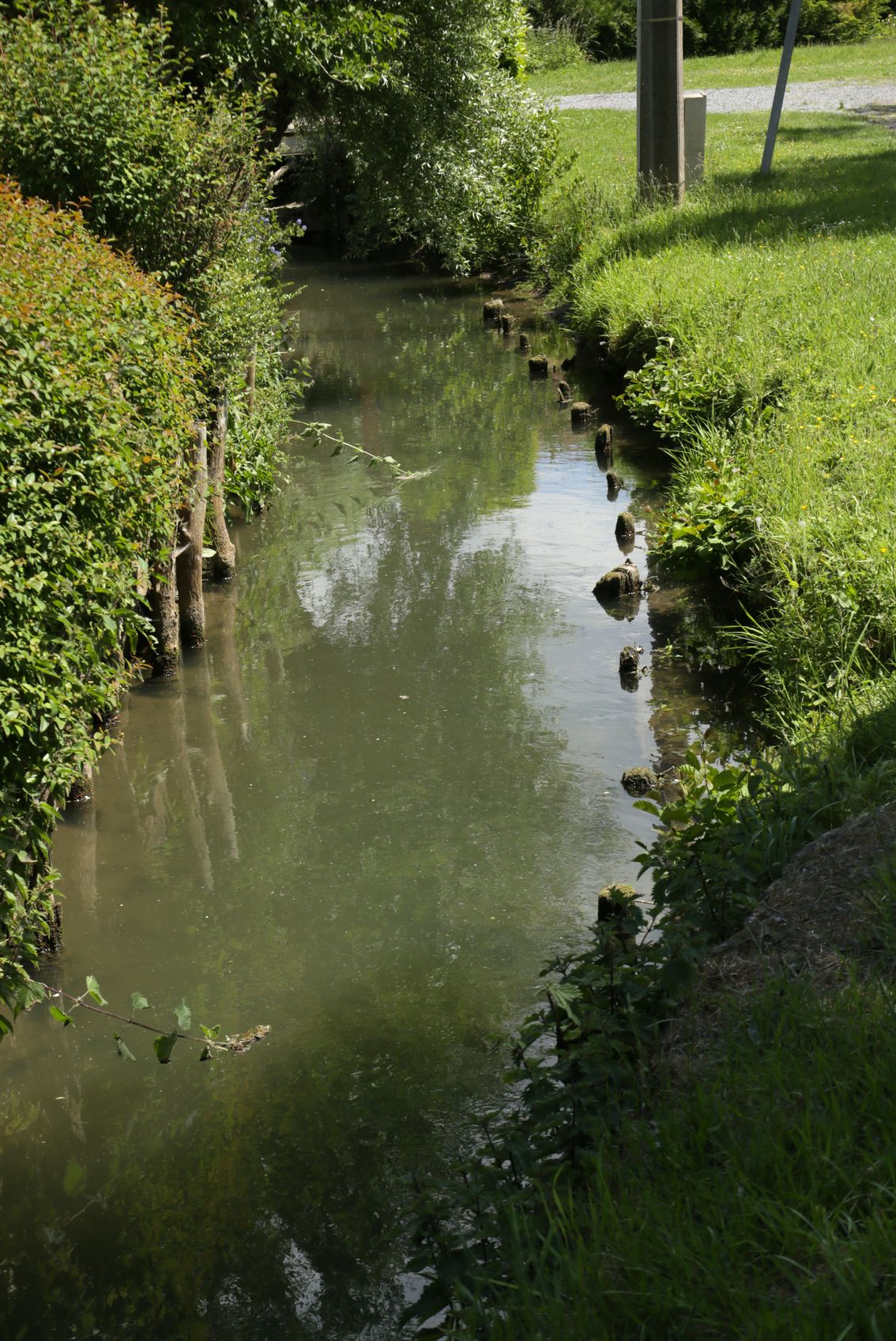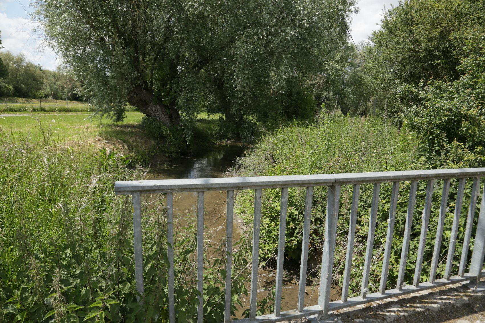 Là, non loin du pont, il me montre une prise d’eau qui détourne une partie du courant vers un fossé sur notre droite, le courant lèche assidument le terrain d’une habitation, au point d’endommager une clôture, penche dangereusement… J’imagine en hiver le travail de sape du cours d’eau…