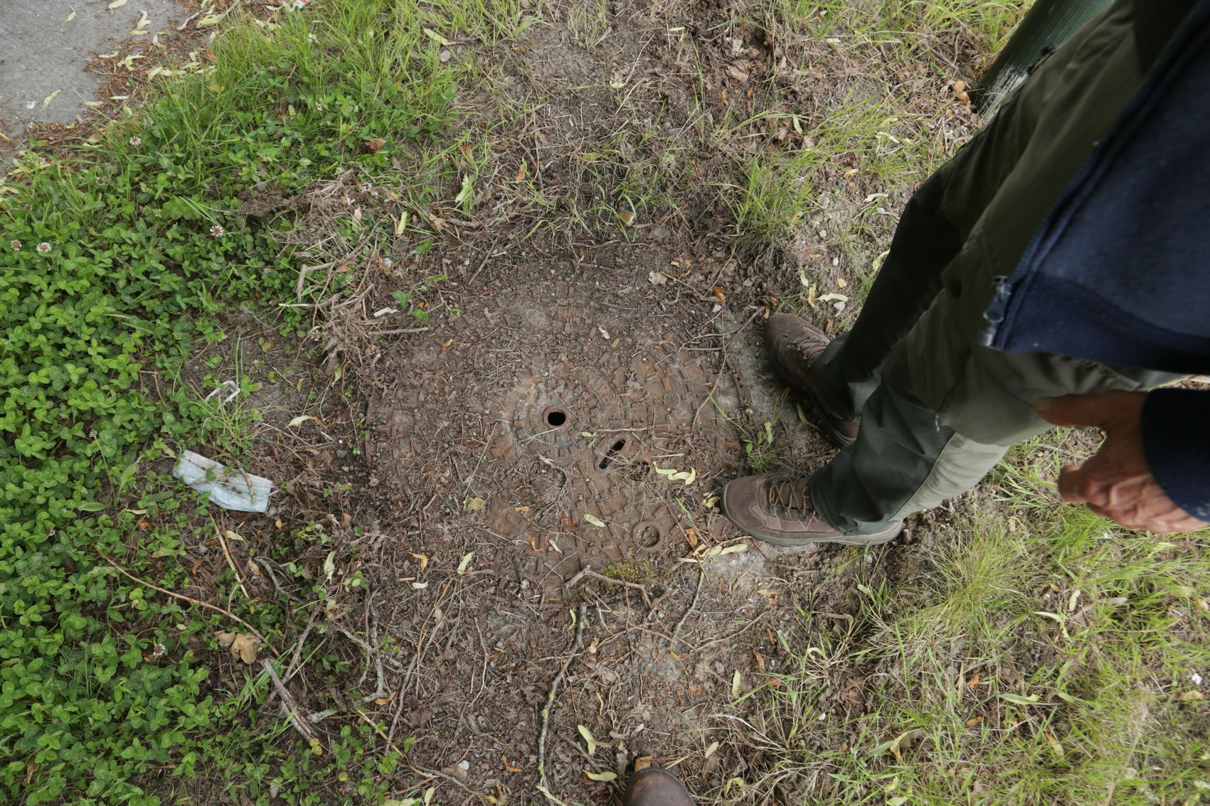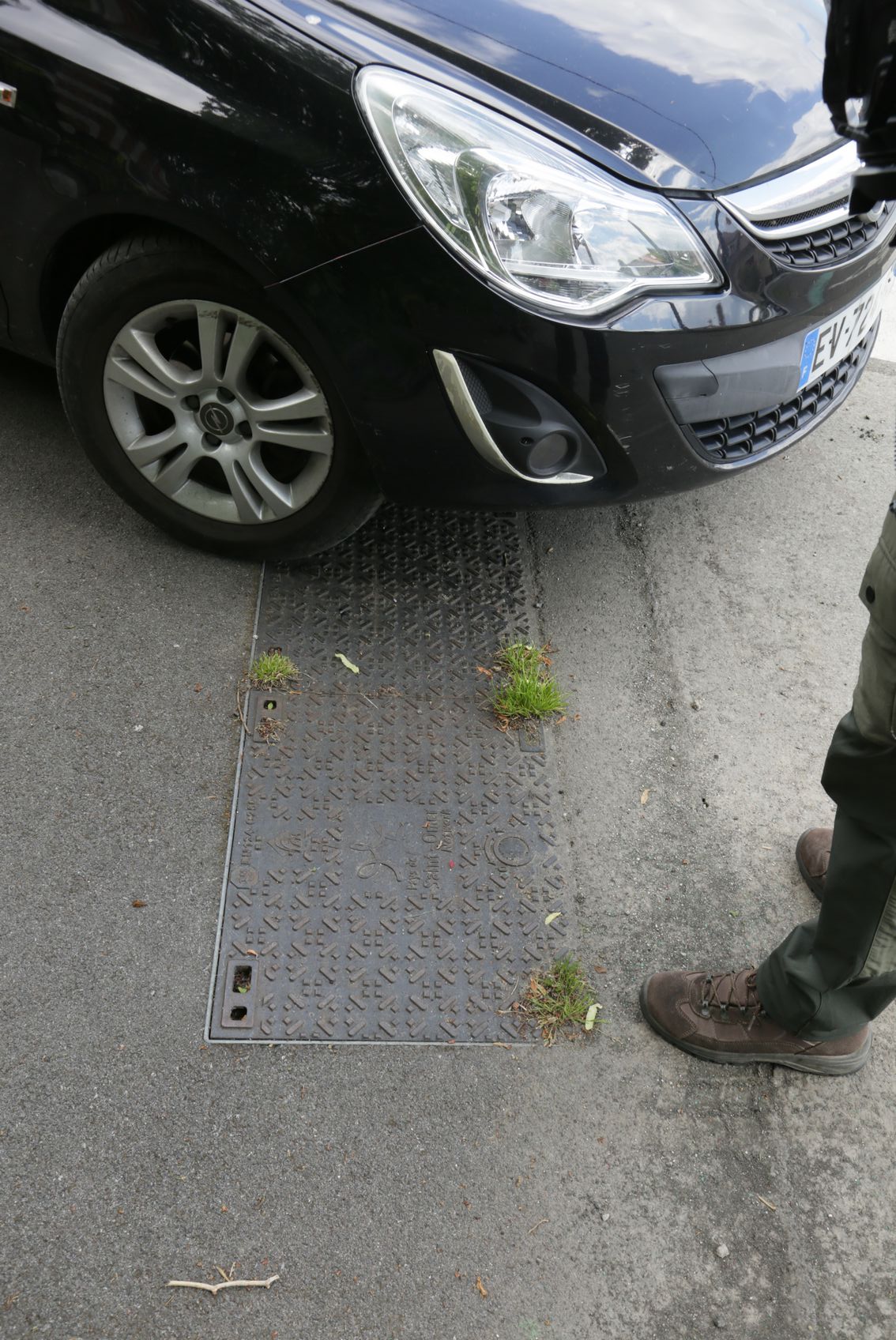 Et hop, retourner de l’autre côté : constater la présence d’autres tampons au bord du carrefour, la prise d’eau est forcément là-dessous, mais cachée, souterraine, sous le bitume…