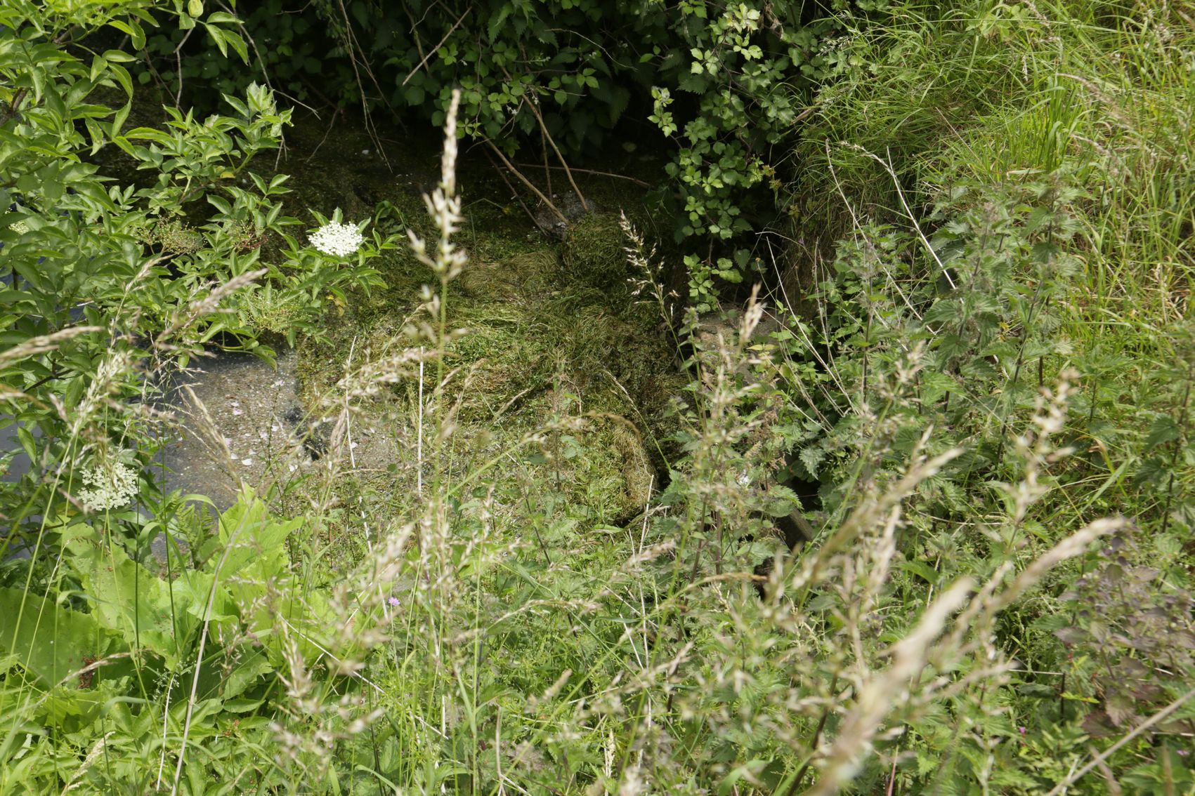 Traverser, aller voir de l’autre côté : bingo ! Le long d’une maison, un fossé à l’eau vive confirme ce détournement d’une autre parti de l’eau de la Lacquette. Nous contournons pour accéder par un champ qui a été fauché ; en nous penchant dans l’axe, nous voyons une arche qui pointe dans la bonne direction…
