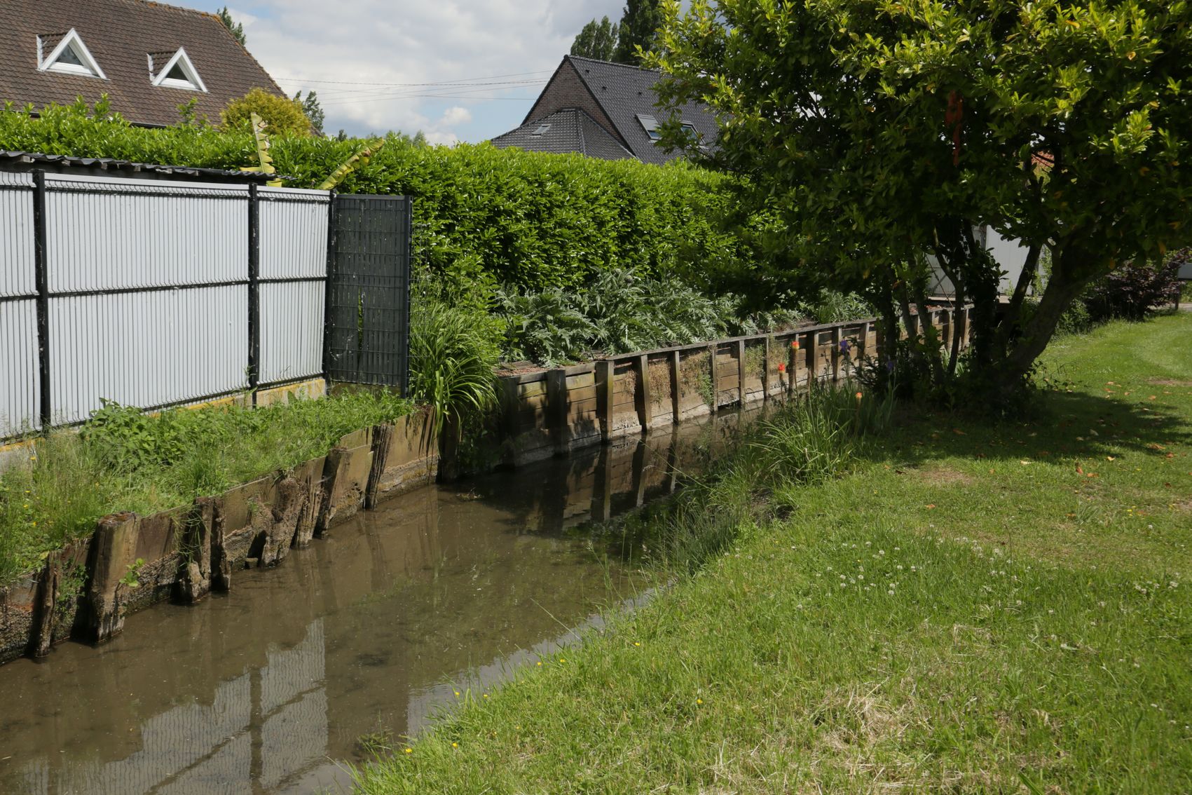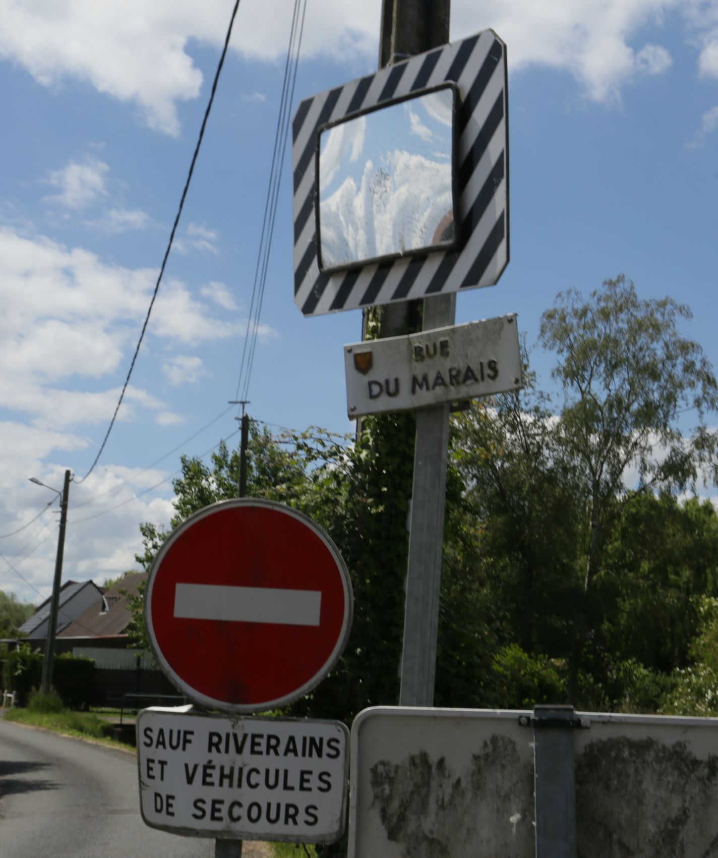 Je m’y perds : des fossés à gauche à droite de la rue, ne se joignent pas, contournent une maison ou reçoivent de nouveaux fossés qui arrivent à la perpendiculaire. Certains ne semblent pas actifs, envahi d’une végétation de marais…