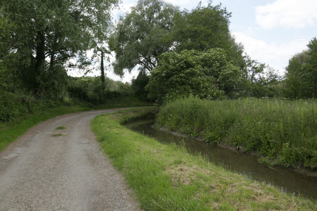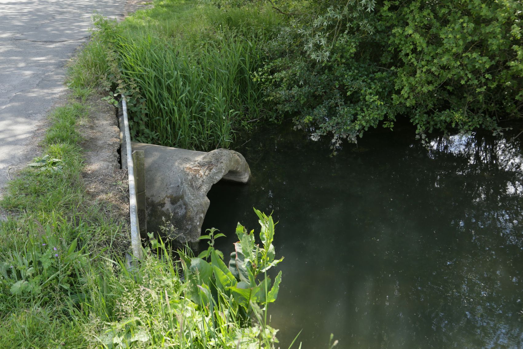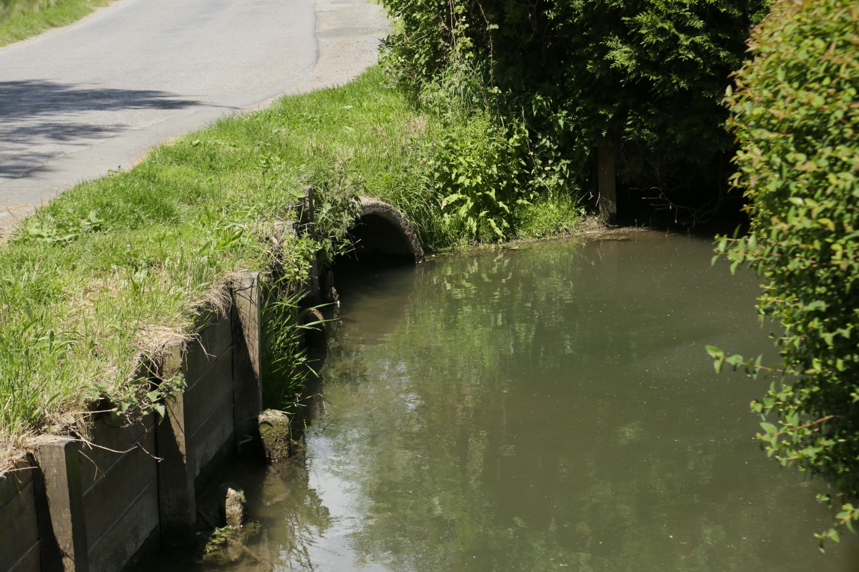 Chemin du Marais de Lenglet, dans un virage, le fossé disparait sous la route… Je m’arrête : une buse amène l’eau dans la Laque « principale », en plein méandre, la rivière se reforme !