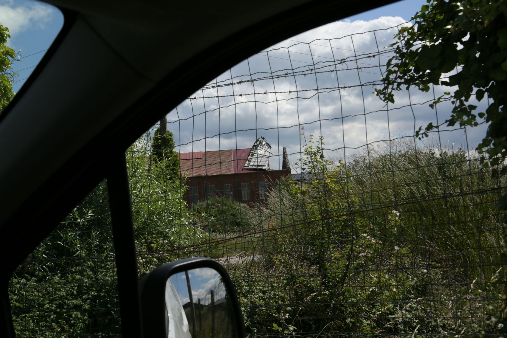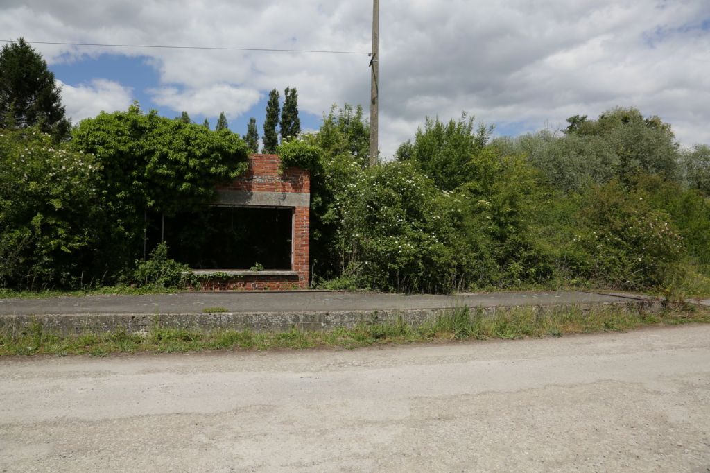 Ce chemin semble se diriger vers le canal : indiqué comme le chemin du Halage de la Roupie… Mmm je commence à douter, plus de rivière en vue, trop loin, les lieux sentent l’abandon… Insister. Des signes d’occupation : une ancienne pesée, une ruine industrielle se profile, hangar rouillé, squelettique… Bruit lancinant d’un tracteur qui tond un terrain de sport improbable…