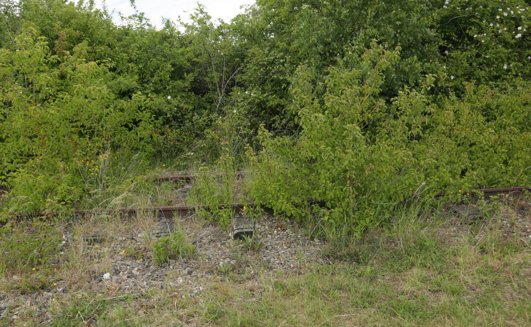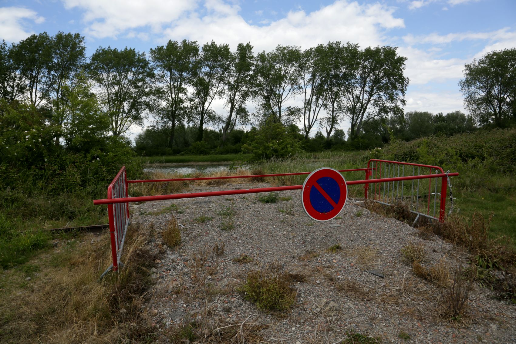 Des rails a demi enterrés confirme l’importance du site… et, sur ma gauche, un signe, un panneau attire mon attention ; je m’approche : le canal, enfin ! Mais rien sur ma gauche.