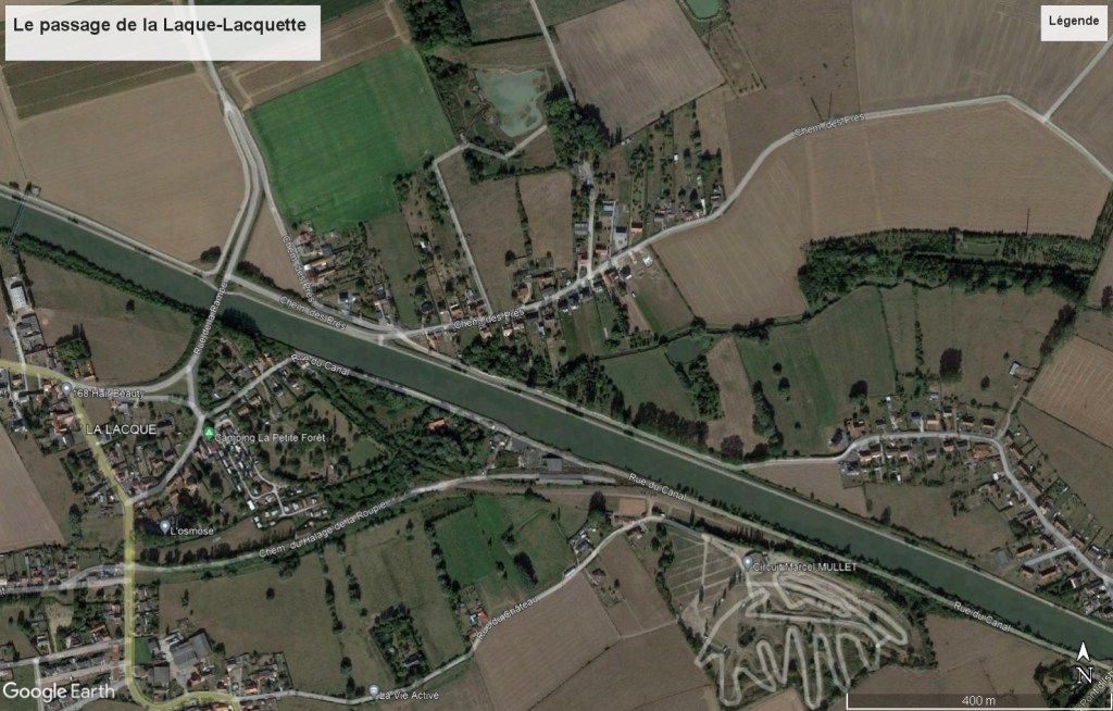 C’est vérifié, L’Echeu – un cours d’eau qui nait d’une dérivation de la Lacquette – se mêle bien à la Laque par de nombreux fossés de délestage ; tous se fondent en un seul cours d’eau avant d’arriver au village La Laque (probablement encore une fiction rassurante…) : officiellement, la Laque, au sud d’Aire. La Laque-Lacquette-Echeu s’en va sous le canal finir sa course dans la vieille Lys… Mais là, c’est une autre histoire qui me fait sortir du bassin de la Lacquette.