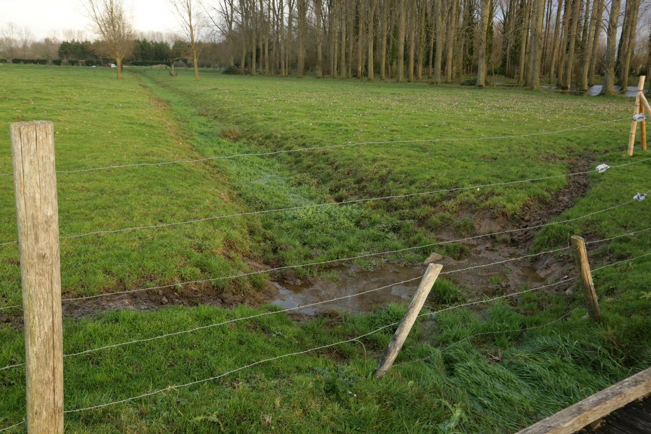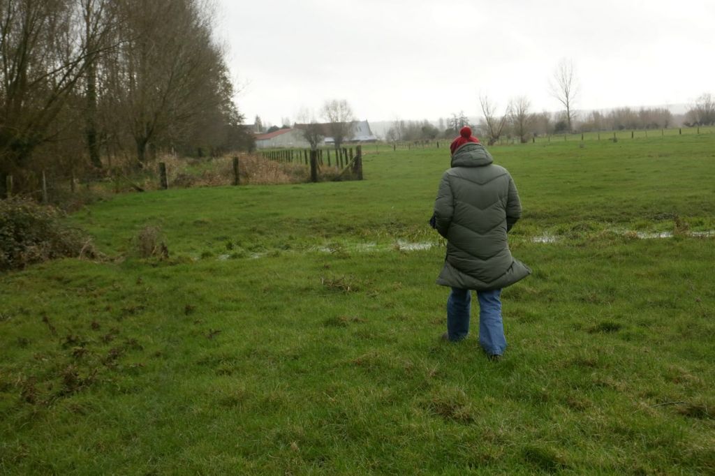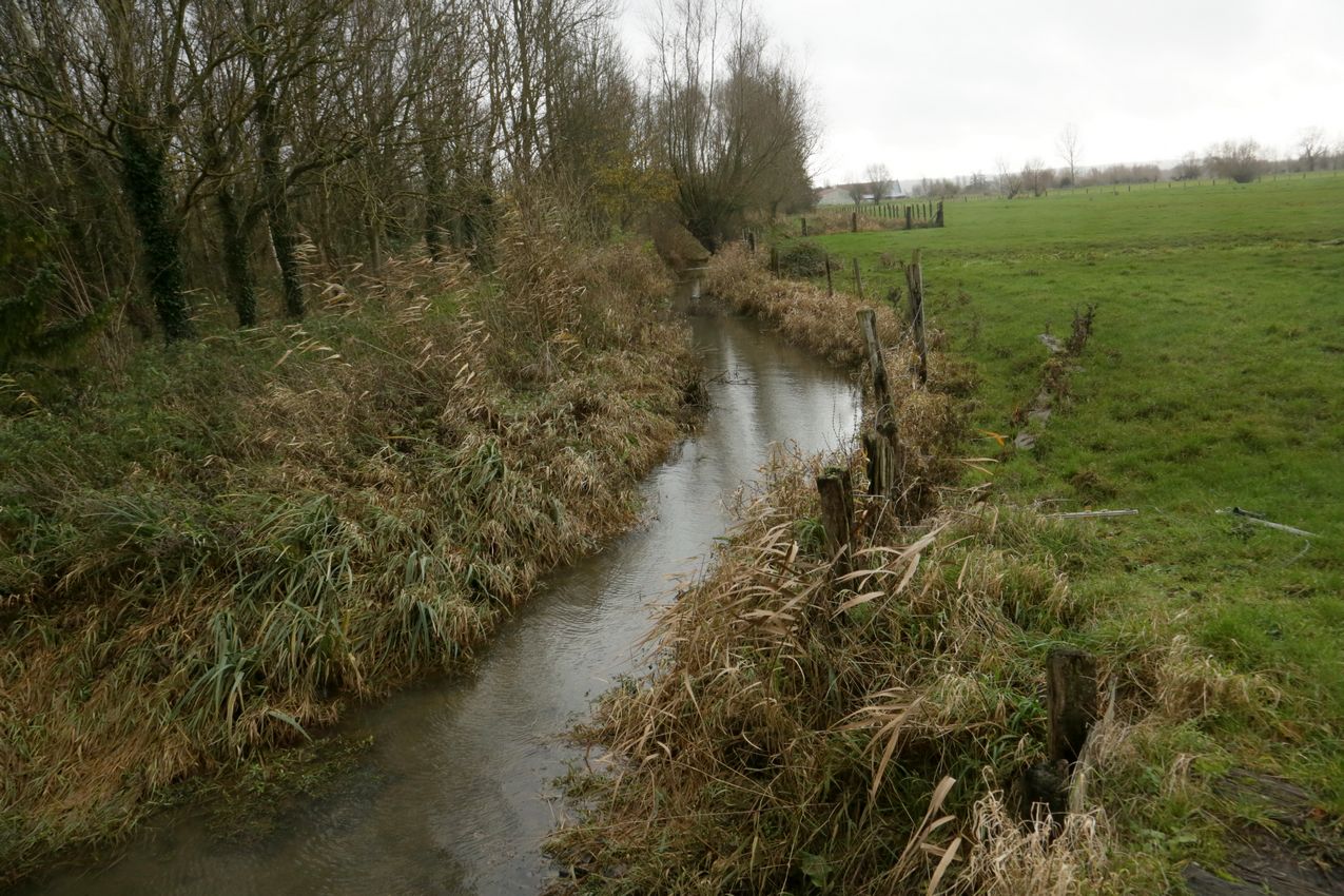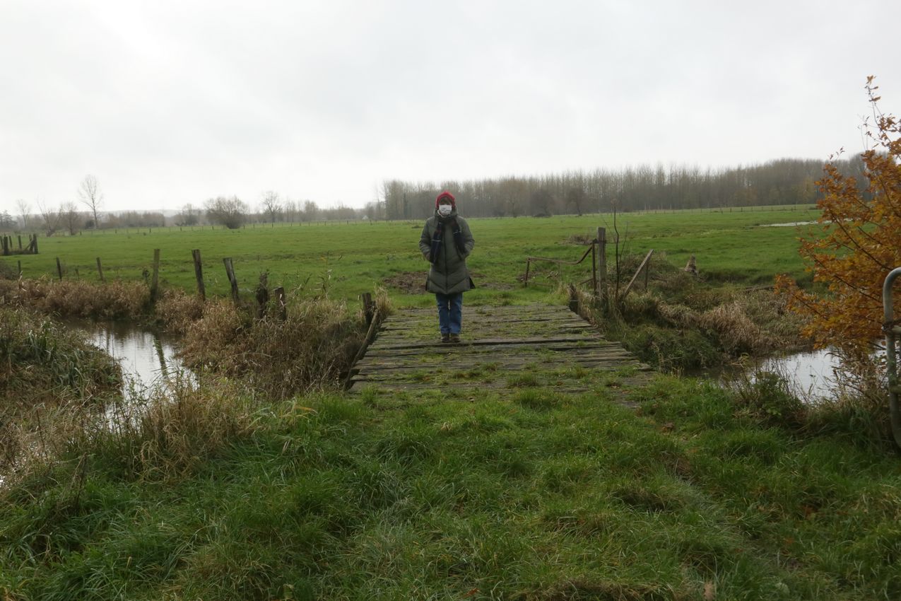 Au retour, Fabienne montre un fossé sur notre gauche, Bertrand nous dit que c’est son fossé de décharge, il remonte et vire à droite et contourne l’étang jusqu’à l’endroit où nous avons vu sa sortie d’eau… Difficile pour nous, de nous rendre compte. Ça corrobore le fait que ce marais est truffé de rigoles et de fossés qui relient ou reliaient des cressonnières, ils se déchargent dans ce fossé central qui conduit les eaux au cours d’eau. Un énorme réseau draine les parcelles, il faudrait imaginer toutes ces résurgences, ces puits artésiens comme autant de sources qui viennent grossir le Mardyck, et font finalement le Mardyck.