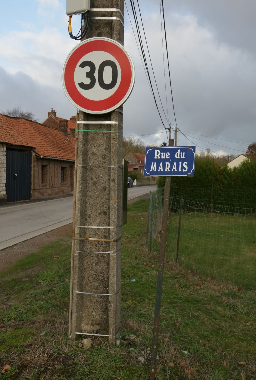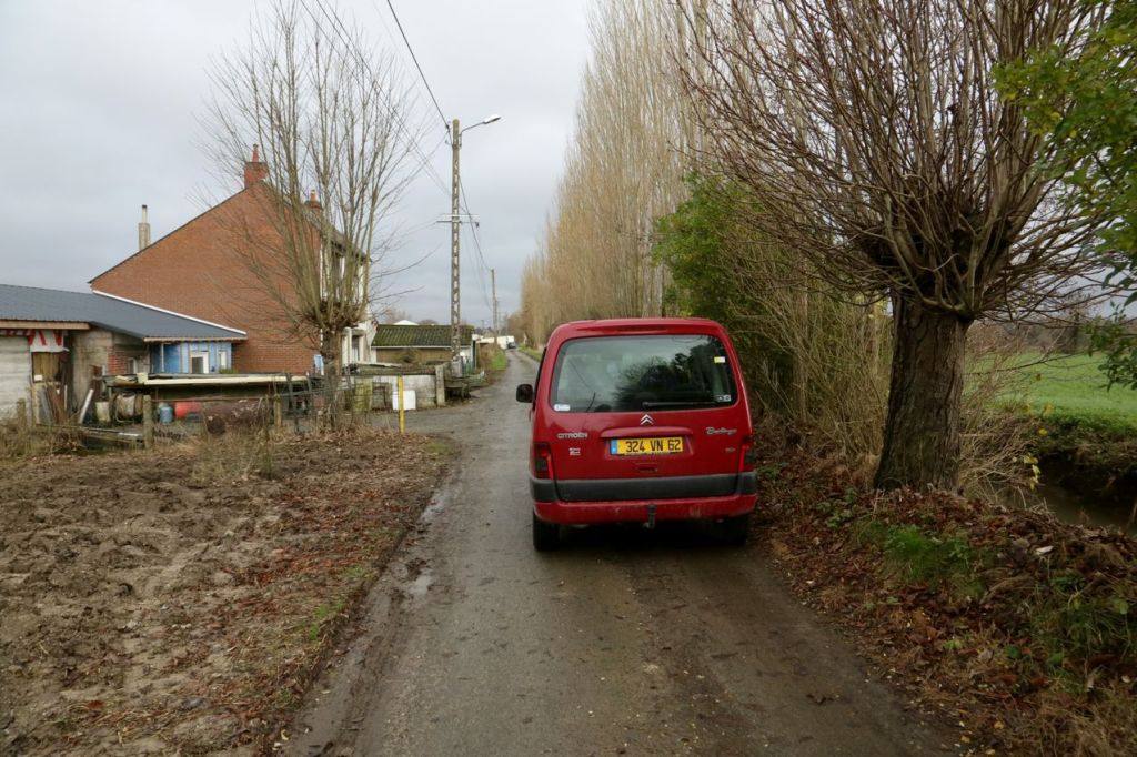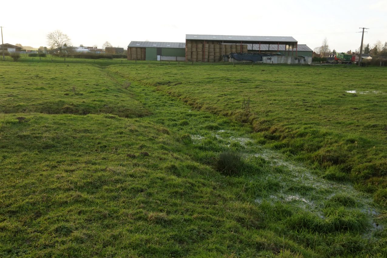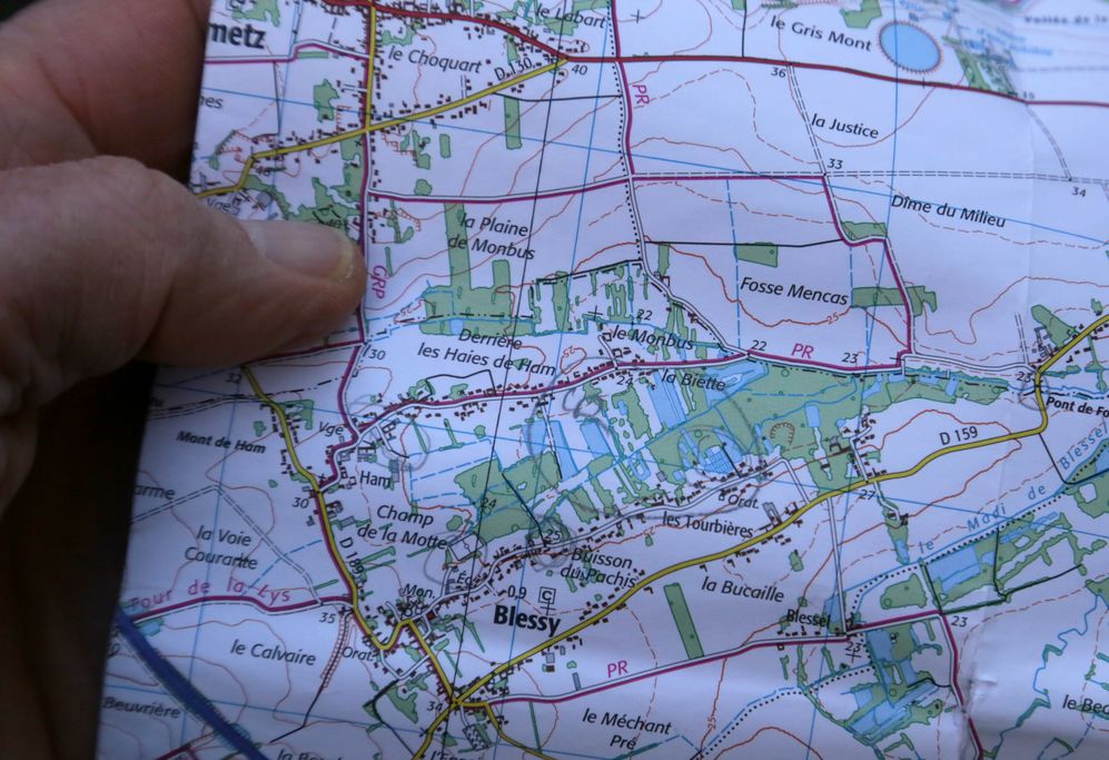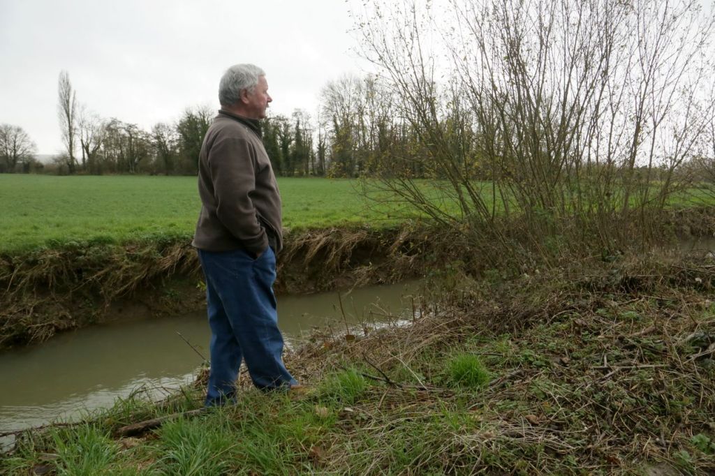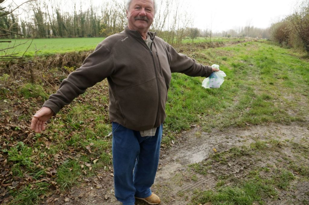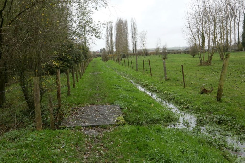 Ça monte légèrement, c’est taluté, derrière, le fossé du Mardyck. Tout ça c’est chez lui, jusqu’à l’eau. De l’autre côté, un pré, nous dit qu’au bout c’est la rue de Ham, je pense reconnaître l’endroit : des tas de bois. Nous échangeons sur ces eaux, effectivement le fossé récolte les eaux des cressonnières, je lui parle de ma confusion entre ce bras et le Mardyck qui coule a bout, le long de la rue de Montbus, pour lui c’est le Mardyck ici. Je lui sors la carte IGN sur laquelle le Mardyck est un petit cours d’eau qui s’enfonce dans la campagne entre la rue de Ham et la rue de Montbus. Bertrand est perplexe car côté importance et débit, c’est bien ce fossé qui alimente le Mardyck. Il nous dit que ce marais a été aménagé de longue date, que les anciens ont trouvé dans cette zone une belle occasion de domestiquer le marais, l’eau affleure ; on peut trouver un peu partout d’anciens forages ou ce qu’il en reste, « l’eau, ici, est à 17 mètres, même si on ne creusait pas elle remonte de toute façon ».