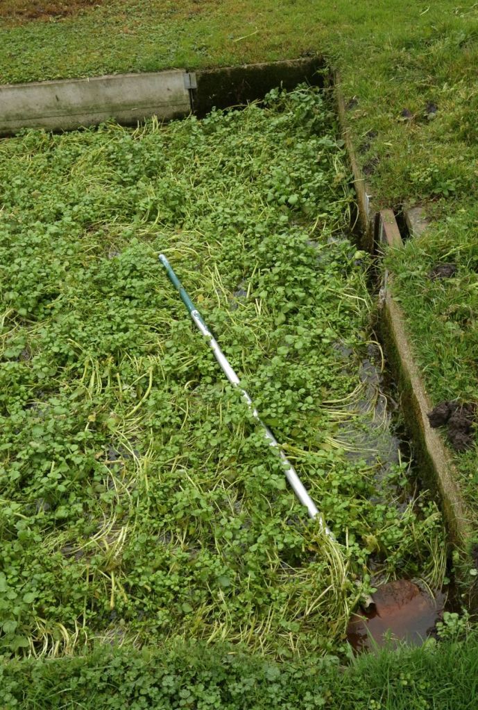 Nous sommes surpris par un tel dispositif, dans les rigoles coule vivement une eau limpide, je note qu’il y a 3 bras, l’un provient du bas de l’exploitation, un autre du haut et le canal de sortie vers le fossé. Il nous explique que les eaux sont conduites sur les côtés, rassemblées et acheminées vers cette sortie. Raconte que ce n’est pas évident, il n’a qu’un dénivelé de 2 cm avec le fond de son terrain. En bas, il a été inondé récemment : « le cresson souffre de l’immersion, c’est une plante semi-aquatique. Ça et le froid, et les feuilles deviennent marron »… il nous montre.