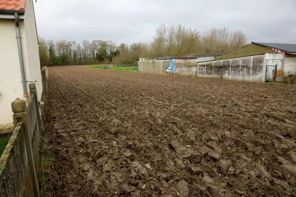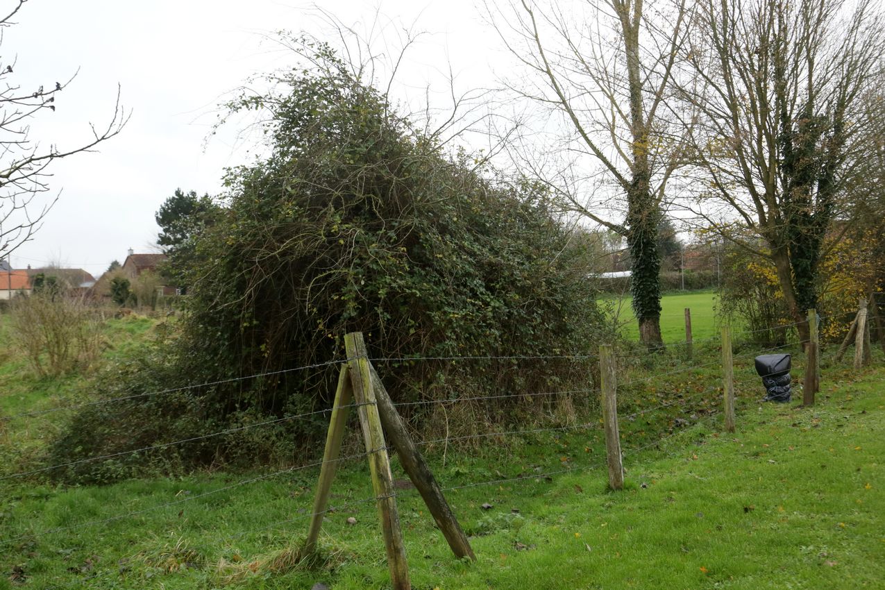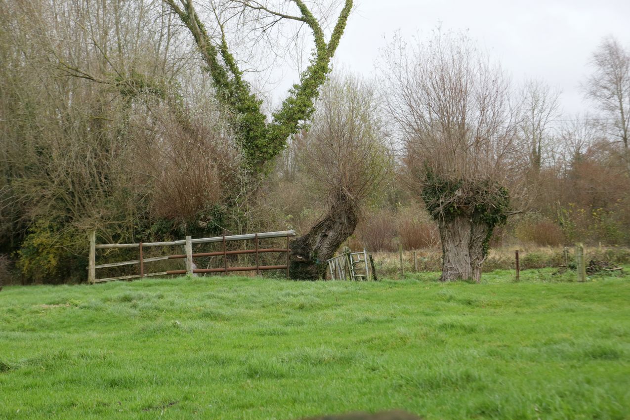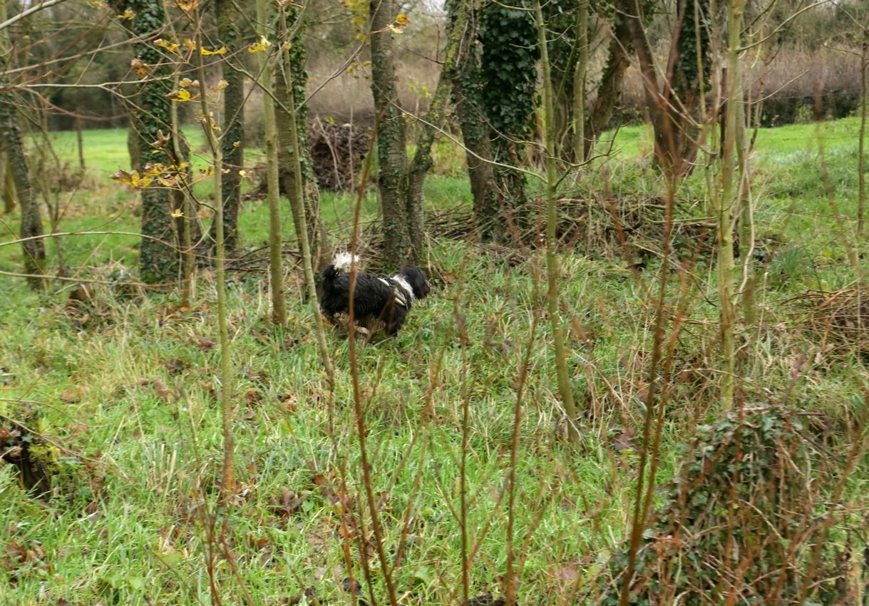 Il trouve que l’eau du fossé s’écoule trop lentement, manque de courant, celui-ci est trop large, trop envasé par affaissement des berges. A côté j’aperçois des thuyas , même quelques saules plantés, nous dit que c’est un jeune qui a fait ça, il vient chasser, fait remarquer qu’il a débordé de la limité de propriété, « il ne connaît pas encore bien ses limites » ; derrière, masqué par la végétation, on devine son abri de chasse… En face, nous apercevons le propriétaire du pré, il nous salue à peine. Bertrand nous raconte une histoire de branche tombée, une fâcherie des campagnes qui peut empoisonner les relations entre voisins…