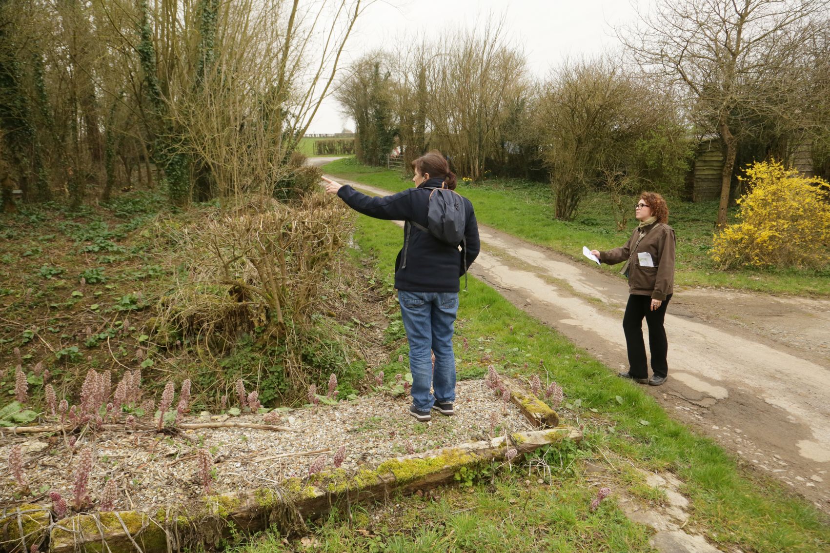 Entrons à gauche dans les Pâtures d’Aire par le premier chemin trouvé. Un peu cabossé, je roule doucement ; observons par la fenêtre, arrêts fréquents… 11h50, arrêt plus long, sommes au croisement de deux fossés, celui qui longe la digue est bien vif, clair ; néanmoins, Calitriche dans l’eau me dit Daniel, « pas bon signe, trop de nitrates », pourtant à part des prés pour les bovins, pas d’activités soutenues ici.