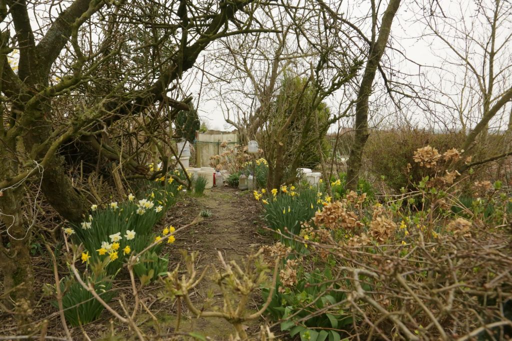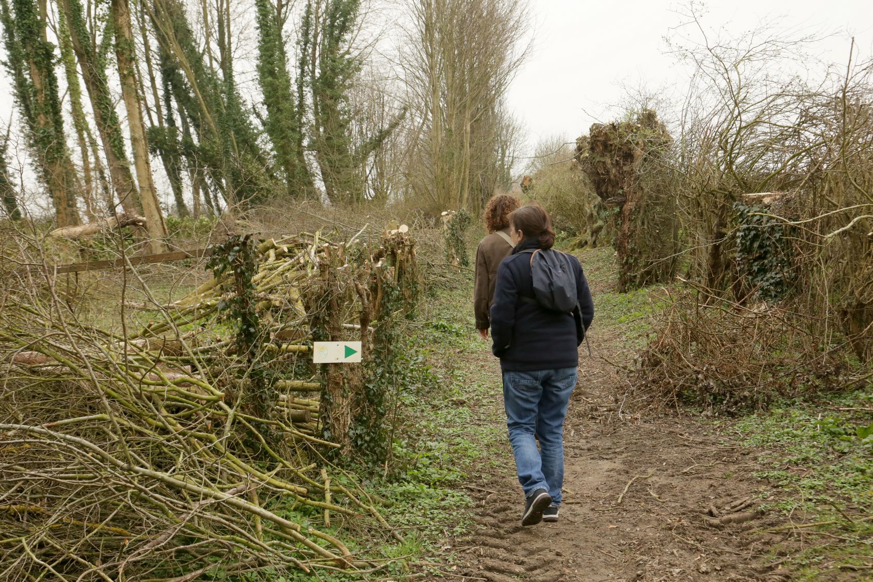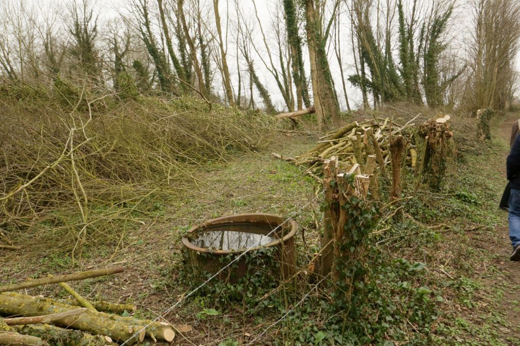 Mais d’abord, prenons le temps d’examiner l’endroit à 360° : vers le bout du chemin, c’est l’impasse, la prairie, des canaux qui interdisent de traverser ; une petite digue embroussaillée qui semblerait nous autoriser à remonter à pieds ; à gauche, un étang, autour, une prairie non fauchée, avec son allure hivernale, hérissée de tiges d’herbe blanchies par la saison écoulée, des trognes de saules, taillées à ras ; un lièvre circule, pas paniqué mais peut-être empêché par les canaux et les clôtures, il s’éloigne tranquillement mais finit par s’activer à nos mouvements… ; à droite, une cressonnière en activité, aux fossés bâchés, partiellement ou découverts, et puis une autre…, plutôt abandonnée, non…, pas totalement, des abris sommaires de chasse : des caches… 1,2,3, disposées le long d’un grand fossé.