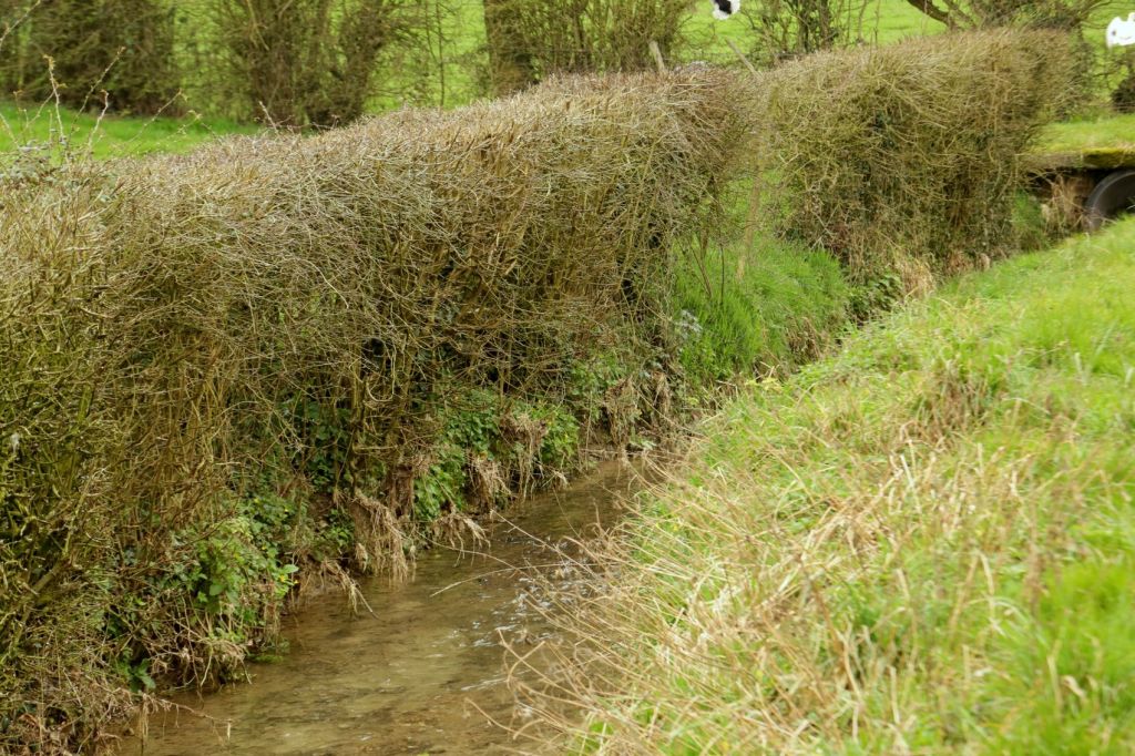A la perpendiculaire, arrive l’eau de l’autre fossé, enfin, arrive c’est vite dit… Nous devisons un temps sur le mouvement de l’eau ; Daniel finit par envoyer une feuille, semble pas trop bouger, le vent ride l’eau… Le mouvement doit être très lent, toutefois on devine bien qu’à certains moments l’eau doit s’écouler franchement, dépend de la saison et de la pluviométrie.