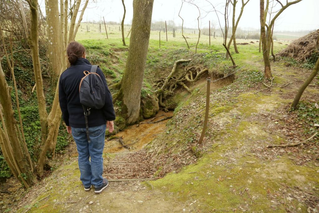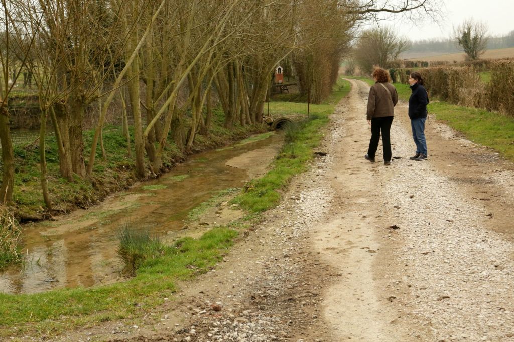 Derrière, au loin, les collines : « tu vois, là c’est là que s’alimente la Lacquette, la craie affleure et facilite l’infiltration, ces collines sont la recharge de la nappe. »