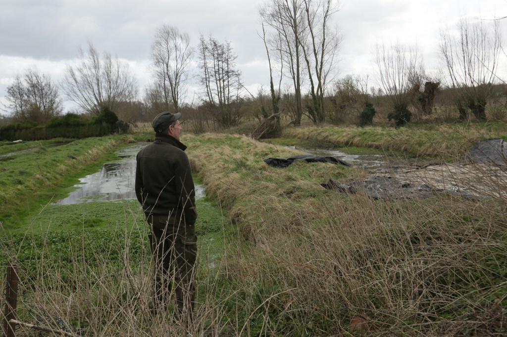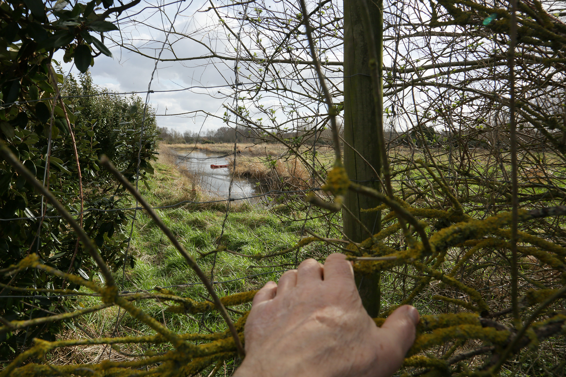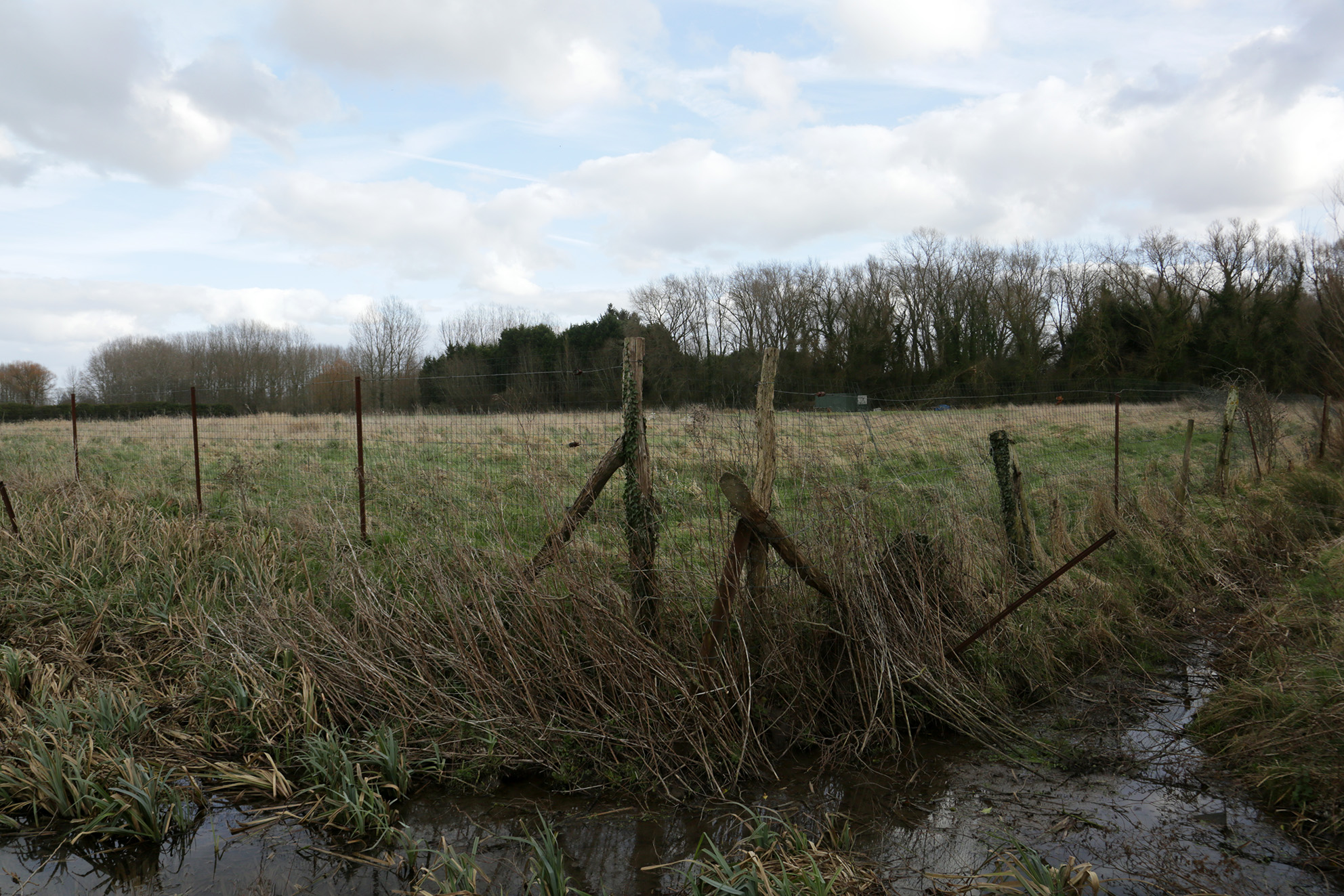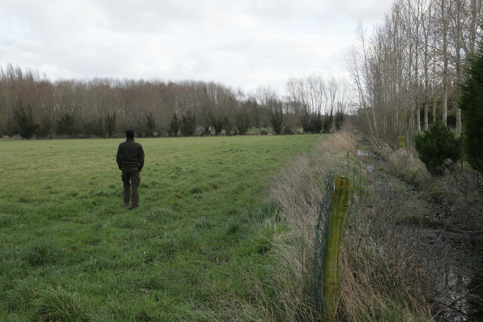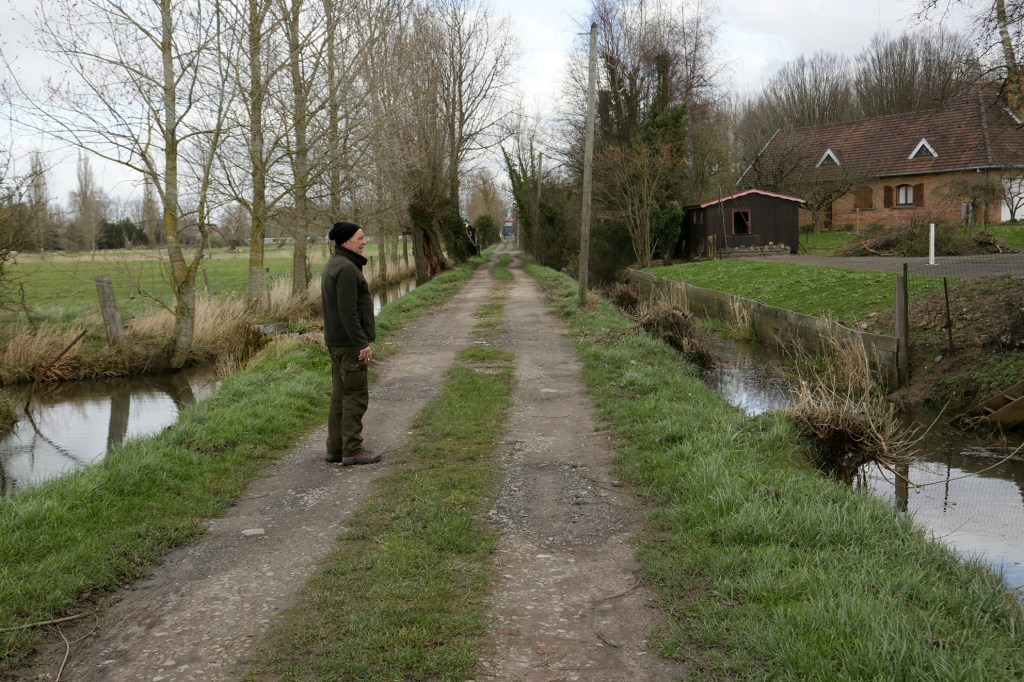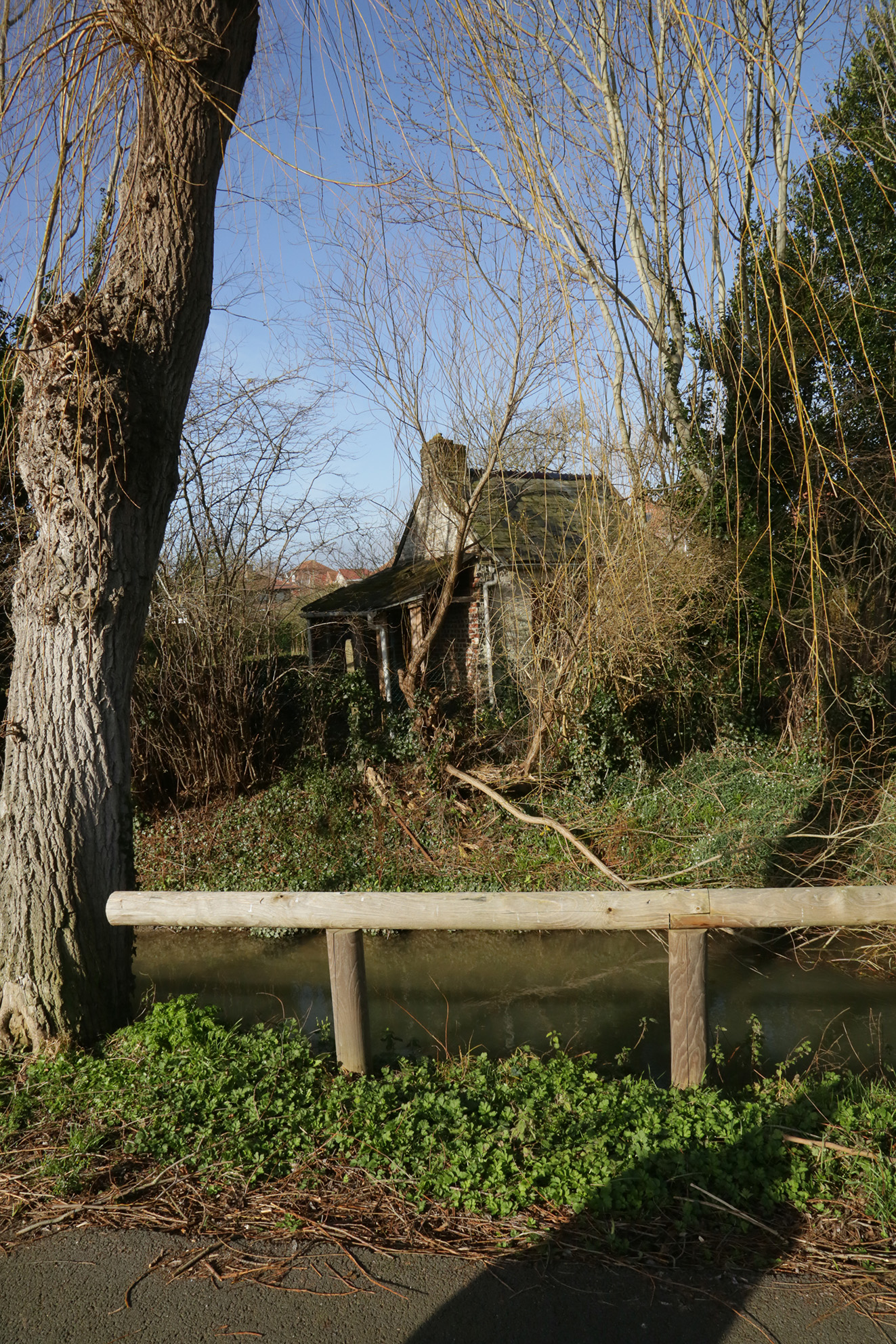 Mais d’abord, prenons le temps d’examiner l’endroit à 360° : vers le bout du chemin, c’est l’impasse, la prairie, des canaux qui interdisent de traverser ; une petite digue embroussaillée qui semblerait nous autoriser à remonter à pieds ; à gauche, un étang, autour, une prairie non fauchée, avec son allure hivernale, hérissée de tiges d’herbe blanchies par la saison écoulée, des trognes de saules, taillées à ras ; un lièvre circule, pas paniqué mais peut-être empêché par les canaux et les clôtures, il s’éloigne tranquillement mais finit par s’activer à nos mouvements… ; à droite, une cressonnière en activité, aux fossés bâchés, partiellement ou découverts, et puis une autre…, plutôt abandonnée, non…, pas totalement, des abris sommaires de chasse : des caches… 1,2,3, disposées le long d’un grand fossé.