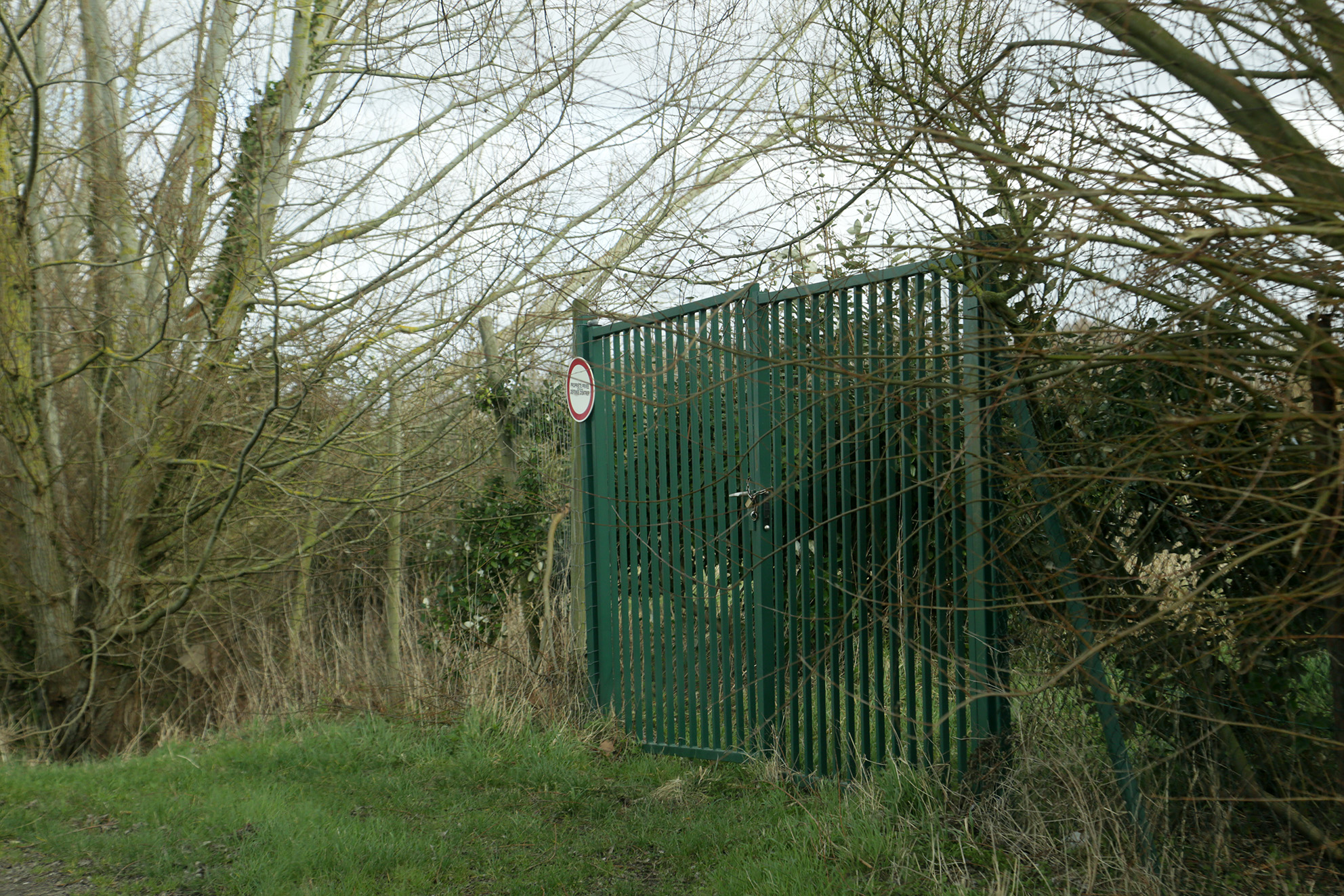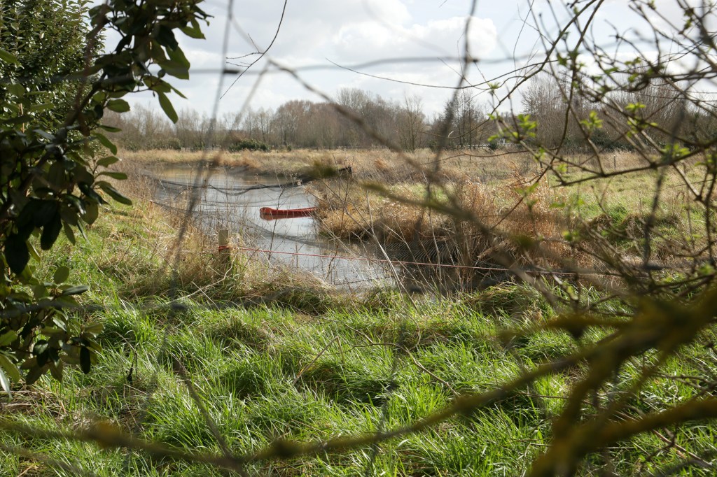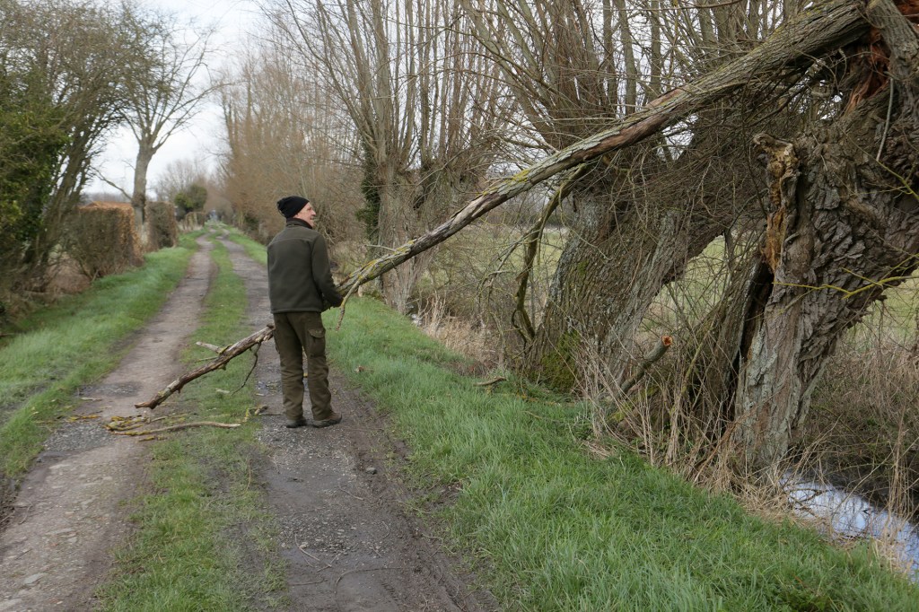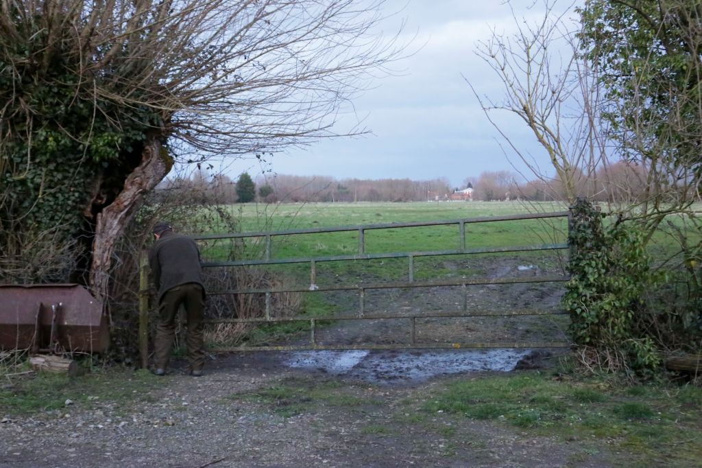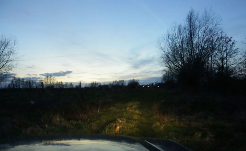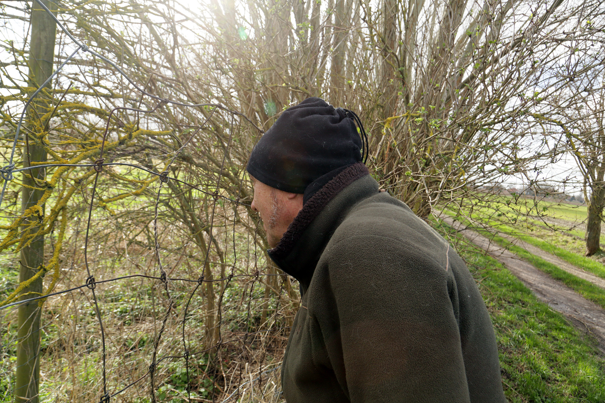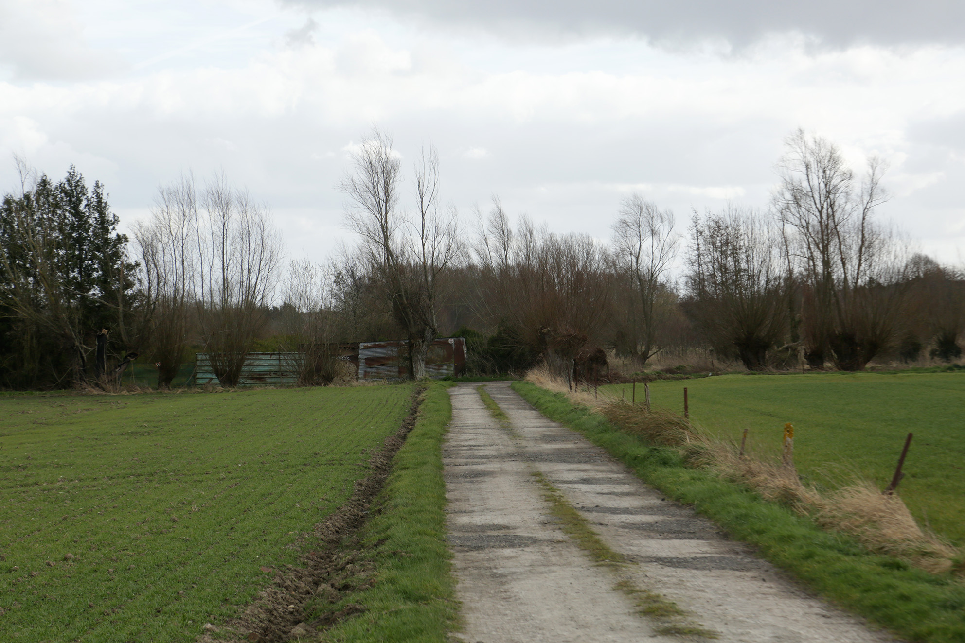 Mais d’abord, prenons le temps d’examiner l’endroit à 360° : vers le bout du chemin, c’est l’impasse, la prairie, des canaux qui interdisent de traverser ; une petite digue embroussaillée qui semblerait nous autoriser à remonter à pieds ; à gauche, un étang, autour, une prairie non fauchée, avec son allure hivernale, hérissée de tiges d’herbe blanchies par la saison écoulée, des trognes de saules, taillées à ras ; un lièvre circule, pas paniqué mais peut-être empêché par les canaux et les clôtures, il s’éloigne tranquillement mais finit par s’activer à nos mouvements… ; à droite, une cressonnière en activité, aux fossés bâchés, partiellement ou découverts, et puis une autre…, plutôt abandonnée, non…, pas totalement, des abris sommaires de chasse : des caches… 1,2,3, disposées le long d’un grand fossé.