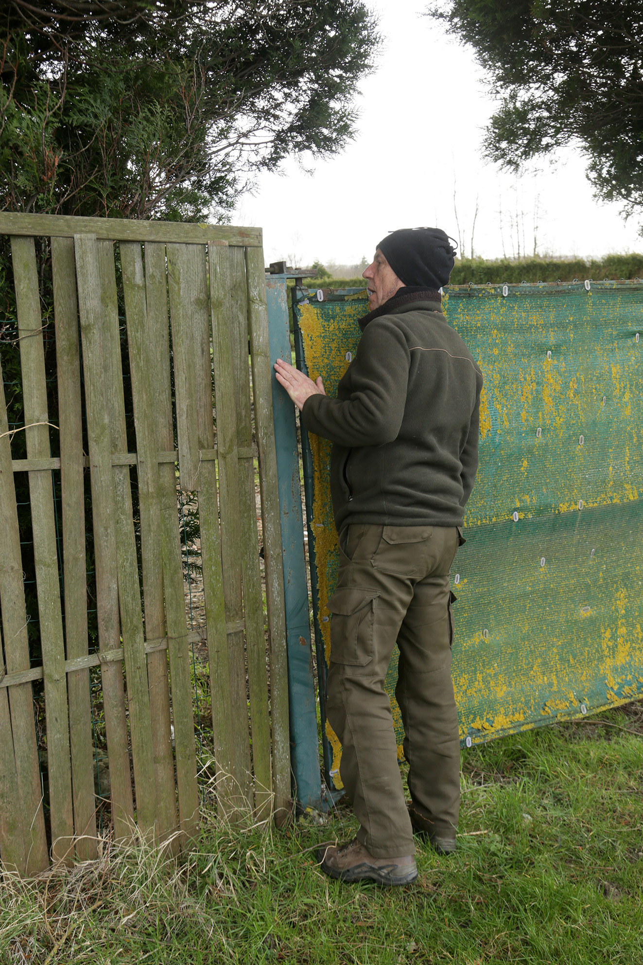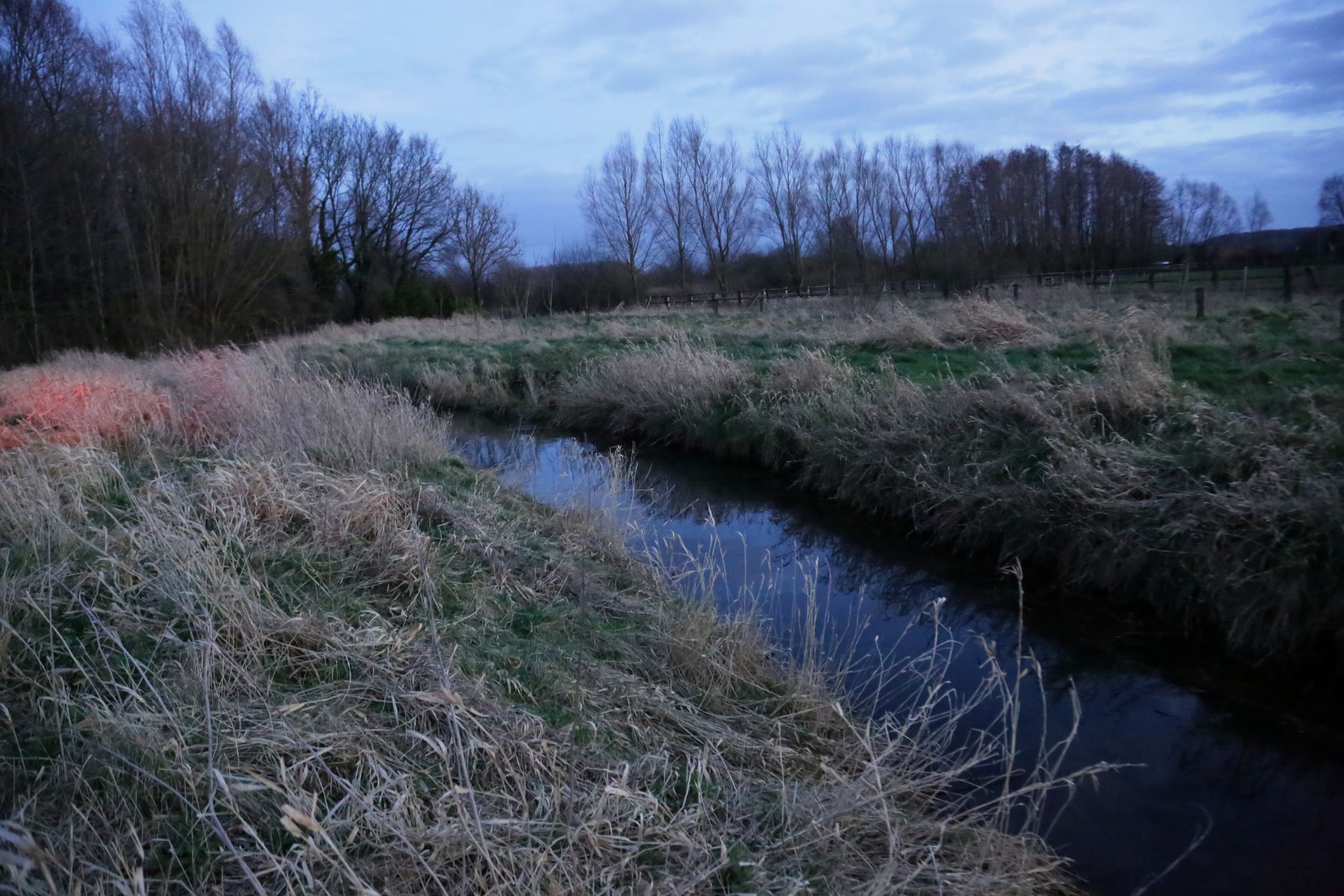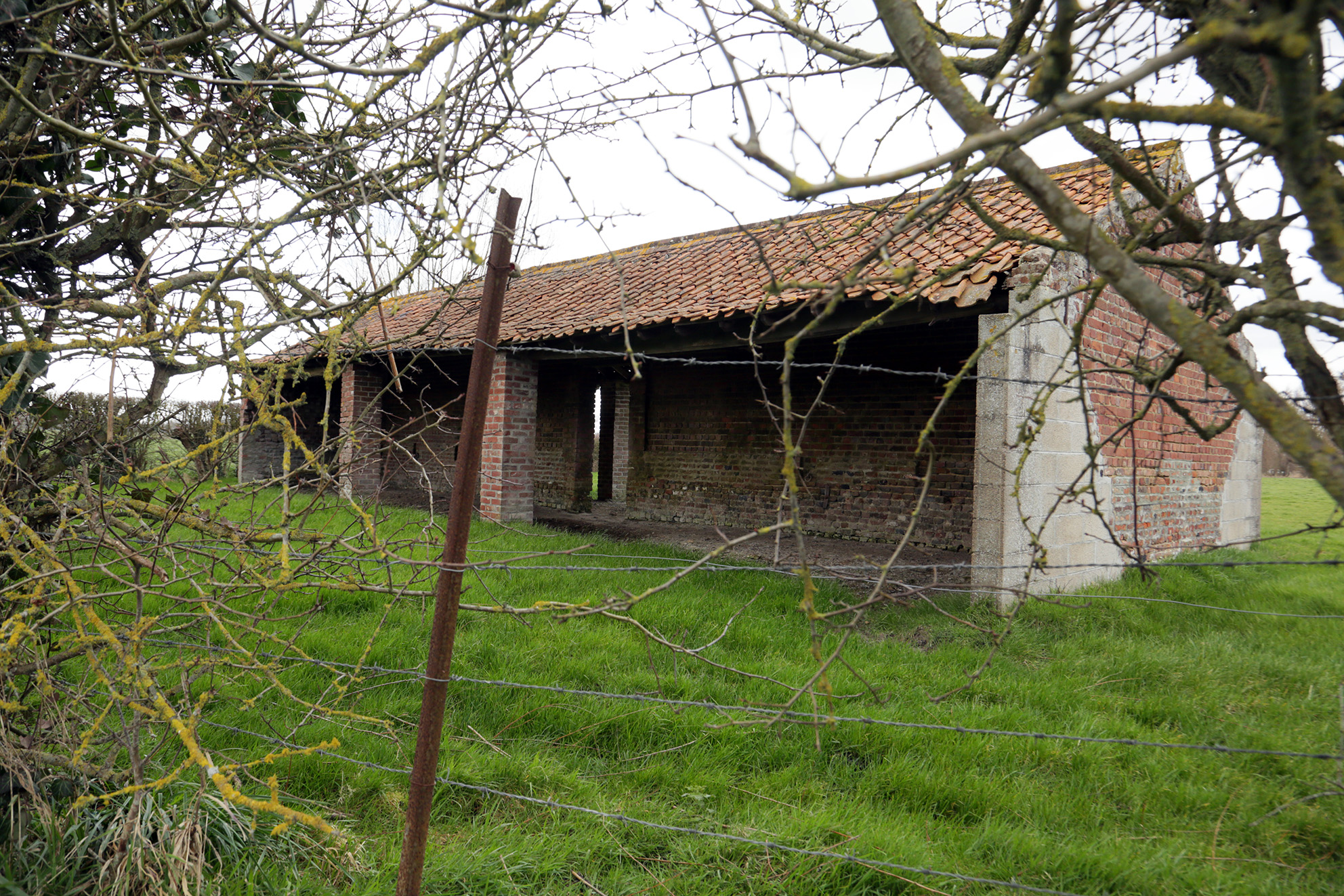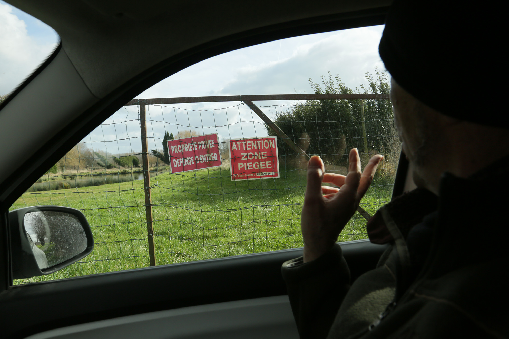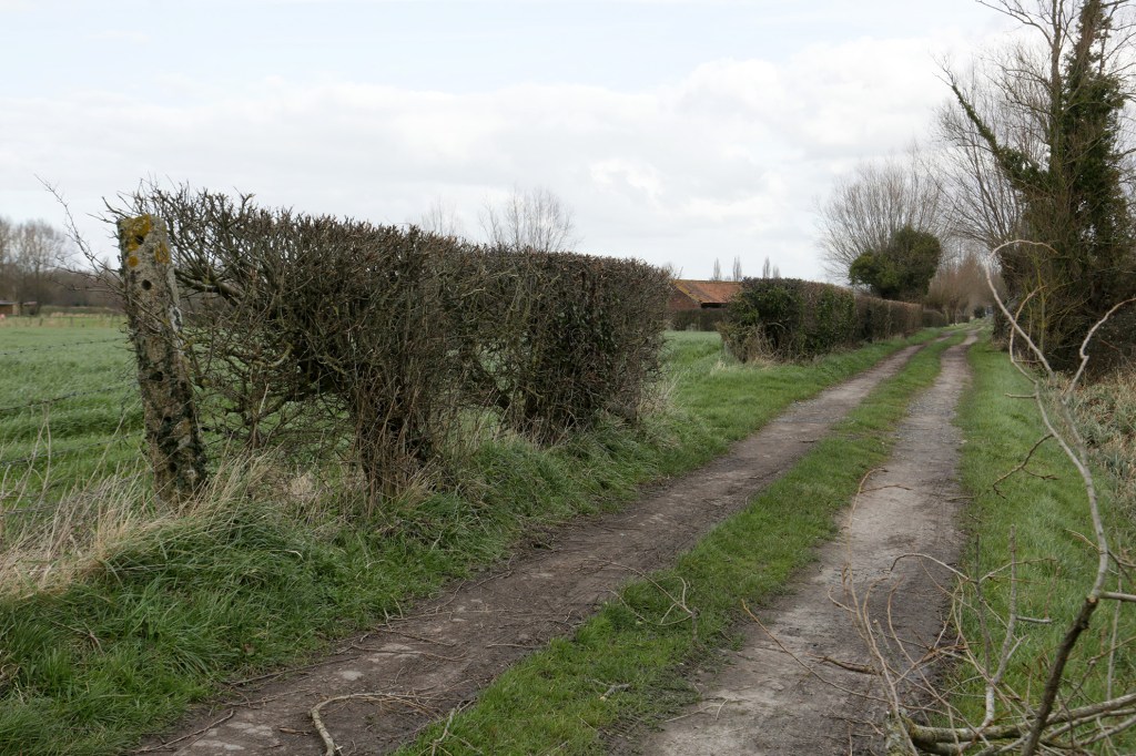 Mais d’abord, prenons le temps d’examiner l’endroit à 360° : vers le bout du chemin, c’est l’impasse, la prairie, des canaux qui interdisent de traverser ; une petite digue embroussaillée qui semblerait nous autoriser à remonter à pieds ; à gauche, un étang, autour, une prairie non fauchée, avec son allure hivernale, hérissée de tiges d’herbe blanchies par la saison écoulée, des trognes de saules, taillées à ras ; un lièvre circule, pas paniqué mais peut-être empêché par les canaux et les clôtures, il s’éloigne tranquillement mais finit par s’activer à nos mouvements… ; à droite, une cressonnière en activité, aux fossés bâchés, partiellement ou découverts, et puis une autre…, plutôt abandonnée, non…, pas totalement, des abris sommaires de chasse : des caches… 1,2,3, disposées le long d’un grand fossé.