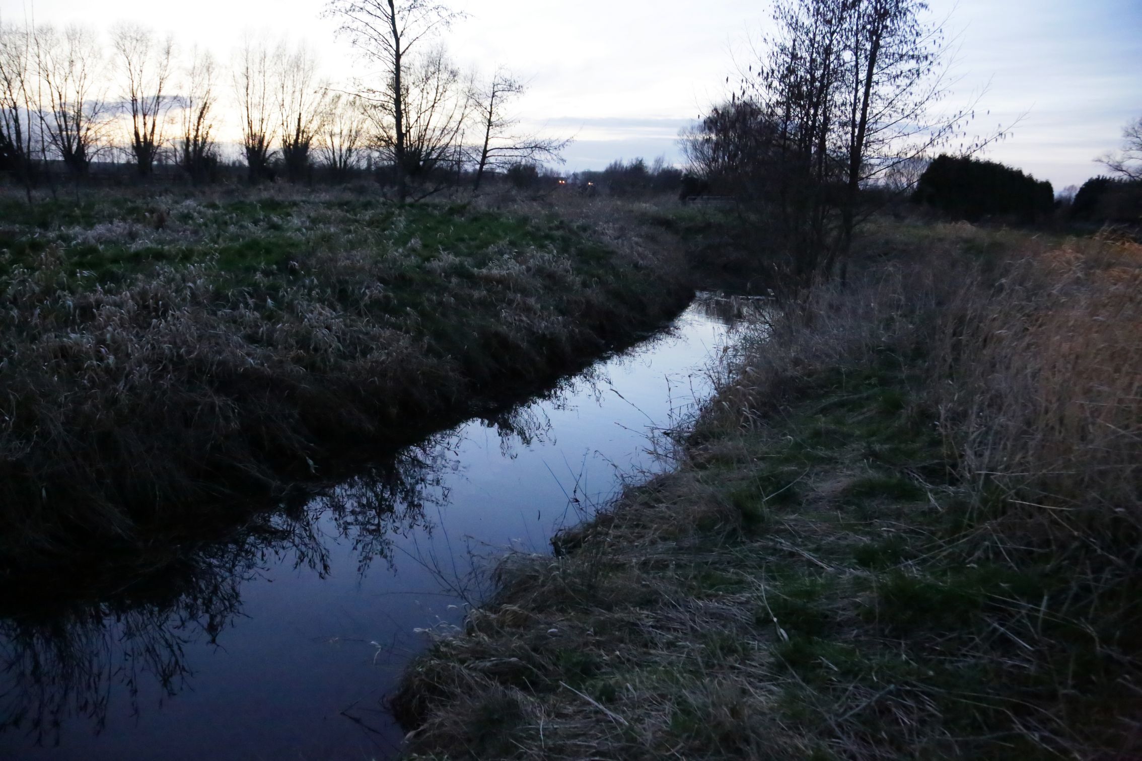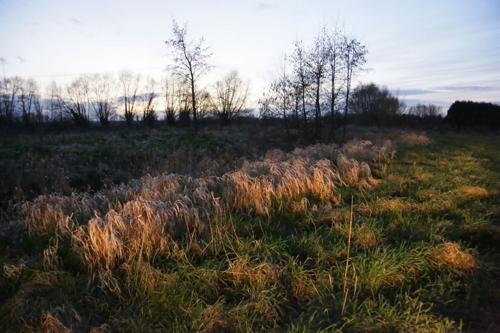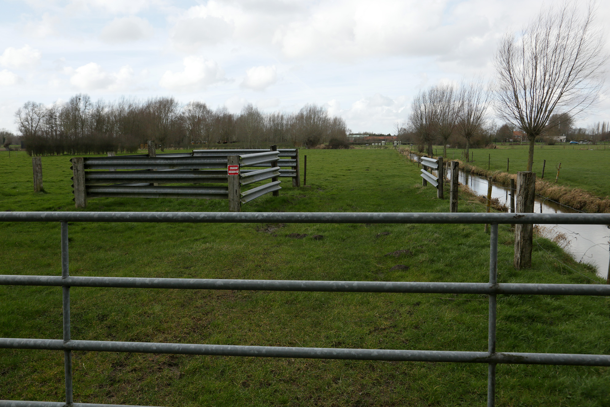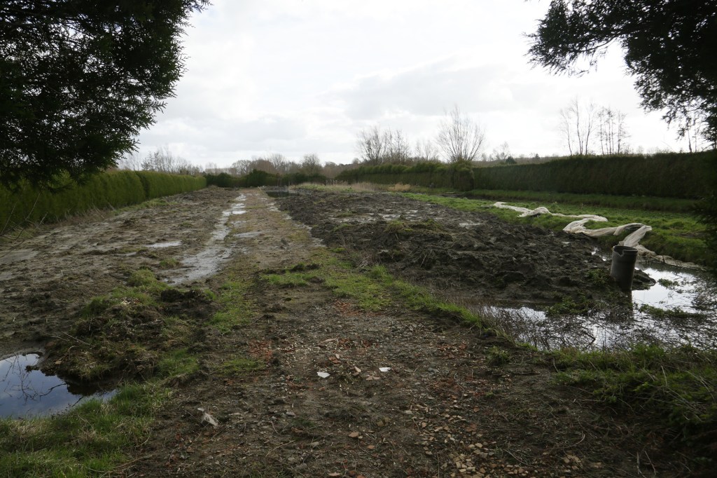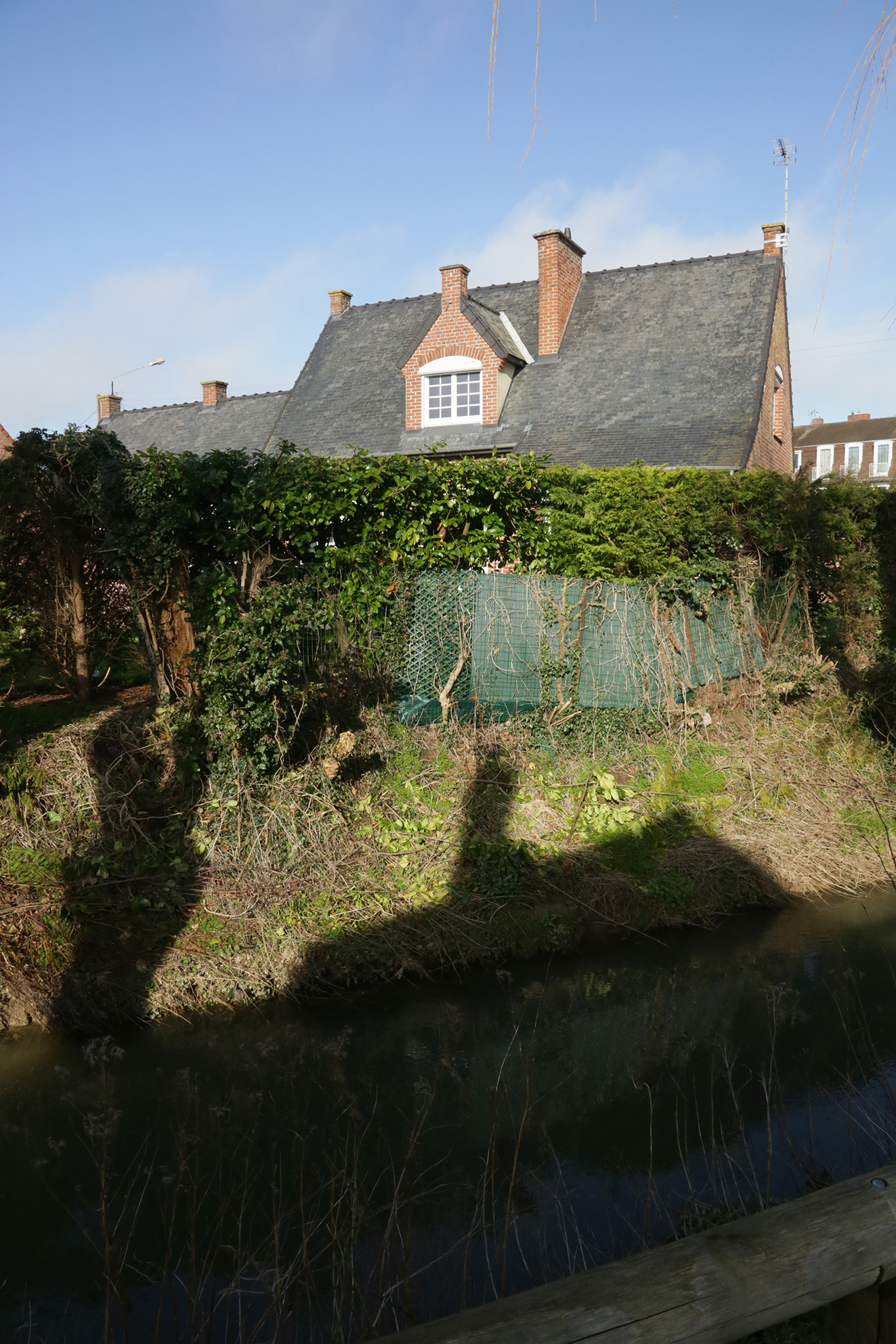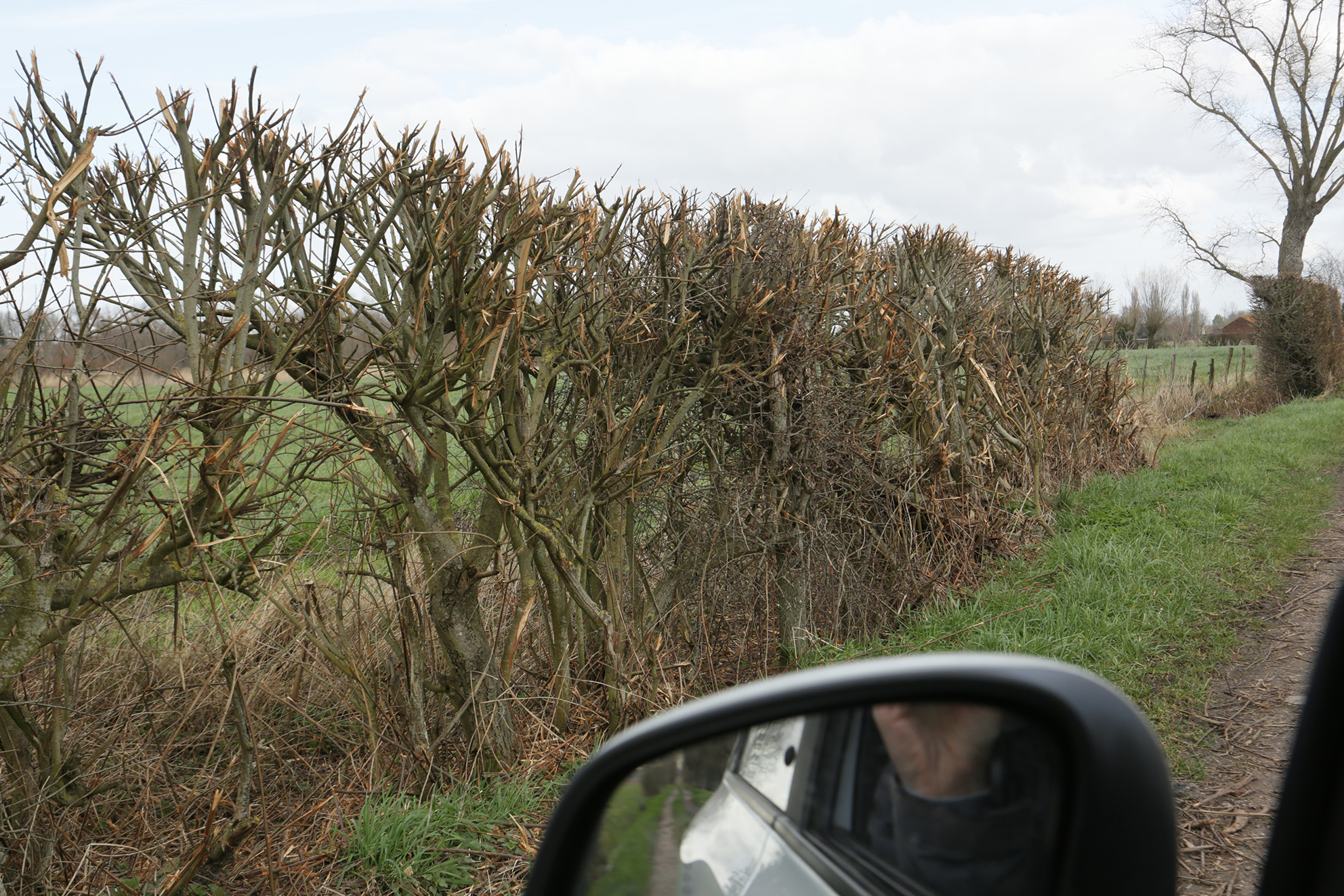Mais d’abord, prenons le temps d’examiner l’endroit à 360° : vers le bout du chemin, c’est l’impasse, la prairie, des canaux qui interdisent de traverser ; une petite digue embroussaillée qui semblerait nous autoriser à remonter à pieds ; à gauche, un étang, autour, une prairie non fauchée, avec son allure hivernale, hérissée de tiges d’herbe blanchies par la saison écoulée, des trognes de saules, taillées à ras ; un lièvre circule, pas paniqué mais peut-être empêché par les canaux et les clôtures, il s’éloigne tranquillement mais finit par s’activer à nos mouvements… ; à droite, une cressonnière en activité, aux fossés bâchés, partiellement ou découverts, et puis une autre…, plutôt abandonnée, non…, pas totalement, des abris sommaires de chasse : des caches… 1,2,3, disposées le long d’un grand fossé.