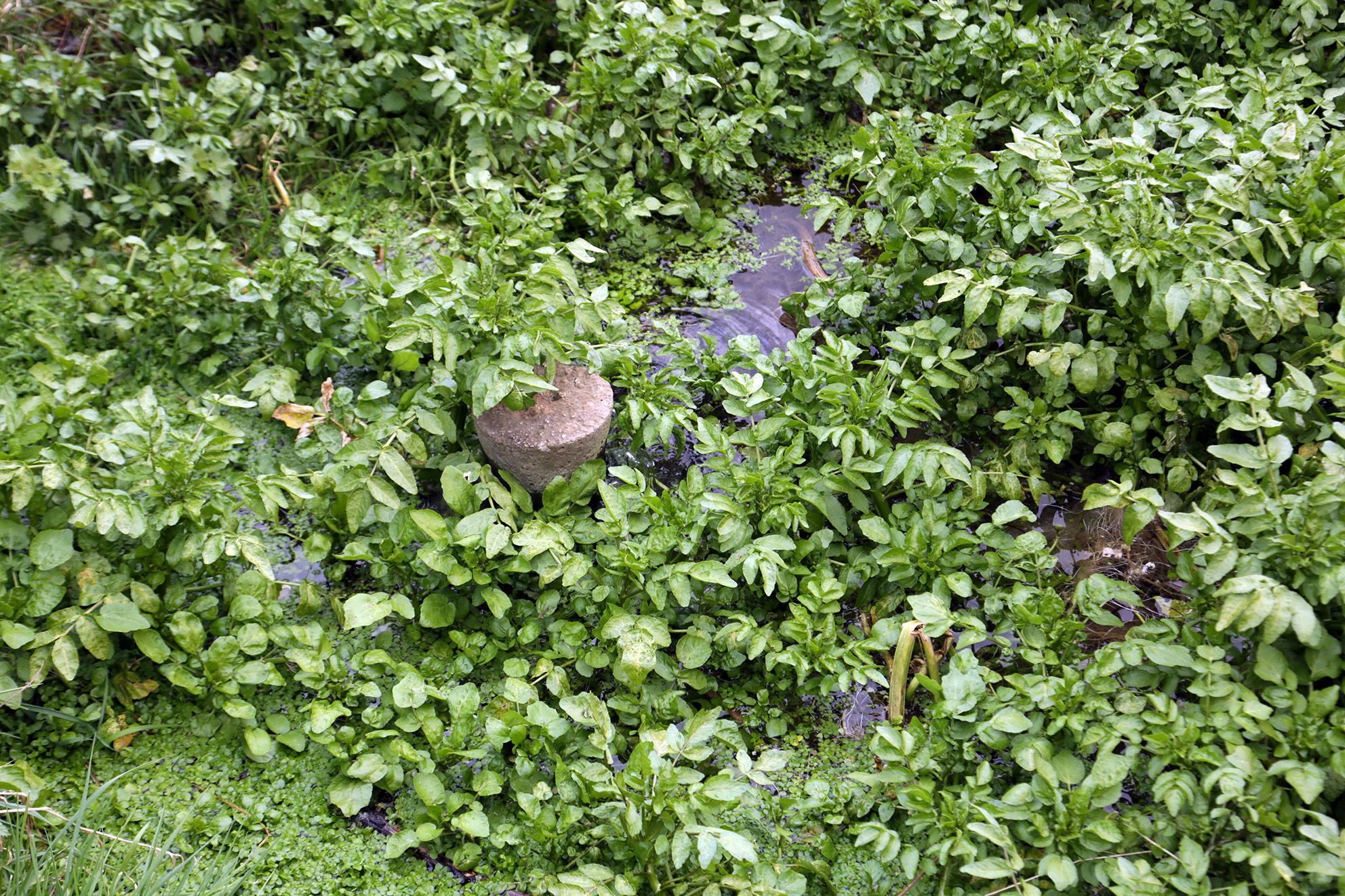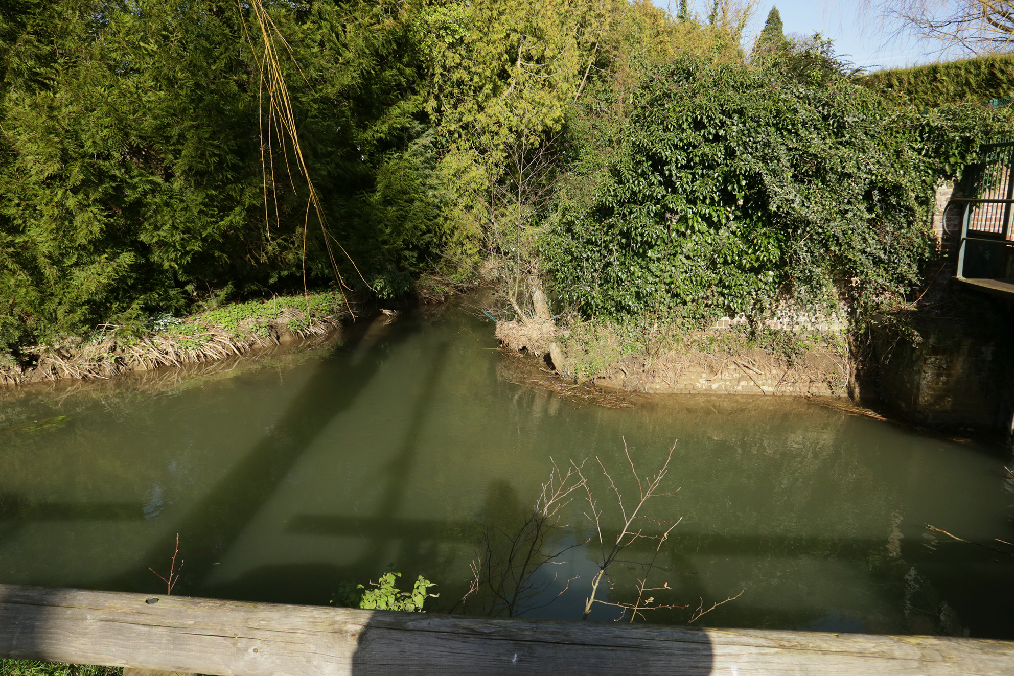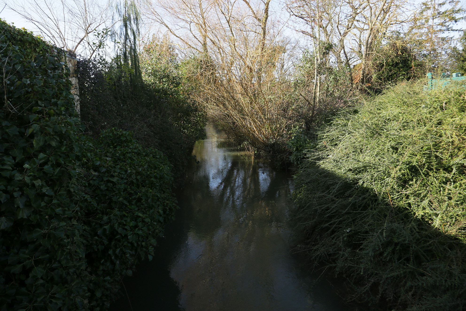 A la perpendiculaire, arrive l’eau de l’autre fossé, enfin, arrive c’est vite dit… Nous devisons un temps sur le mouvement de l’eau ; Daniel finit par envoyer une feuille, semble pas trop bouger, le vent ride l’eau… Le mouvement doit être très lent, toutefois on devine bien qu’à certains moments l’eau doit s’écouler franchement, dépend de la saison et de la pluviométrie.