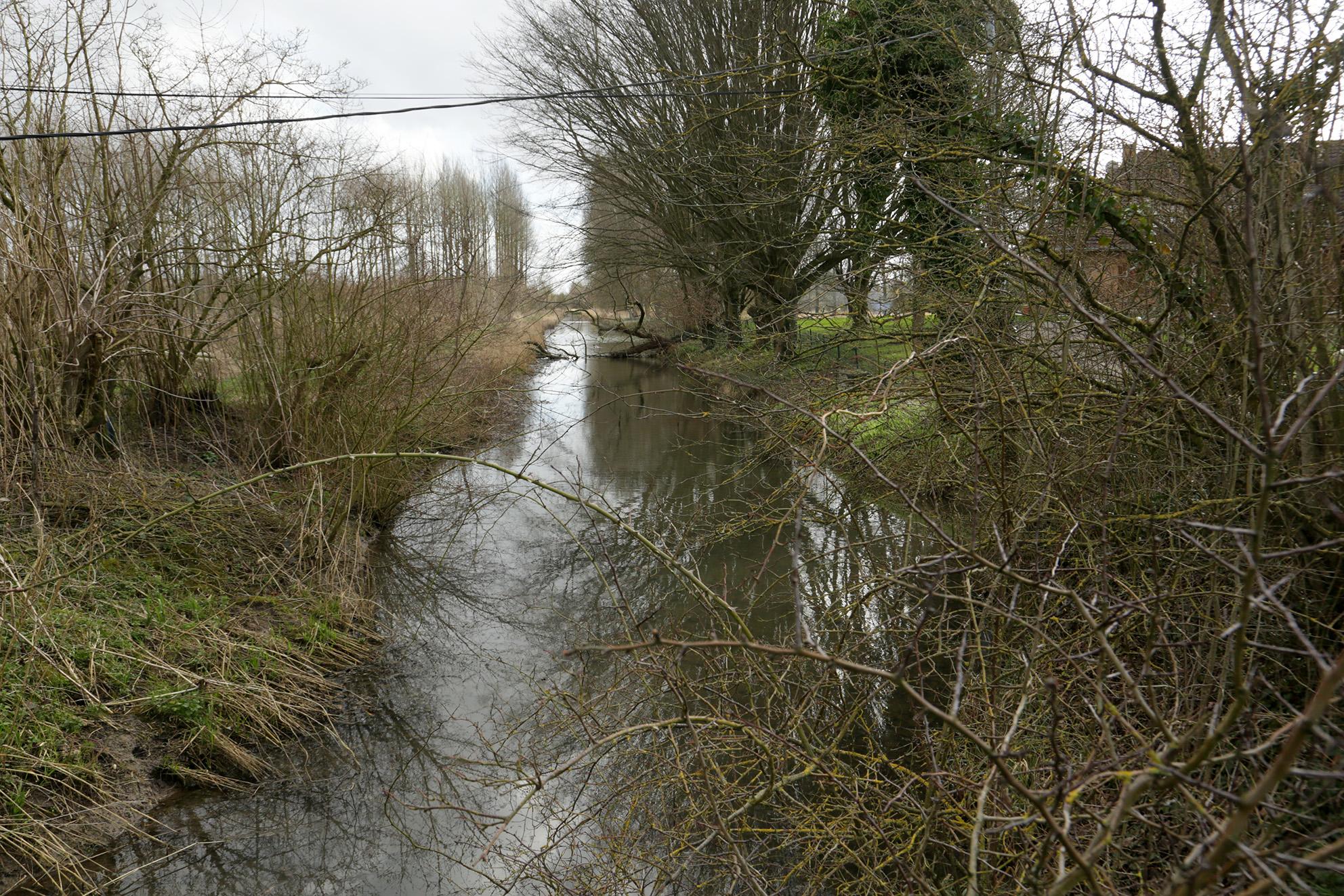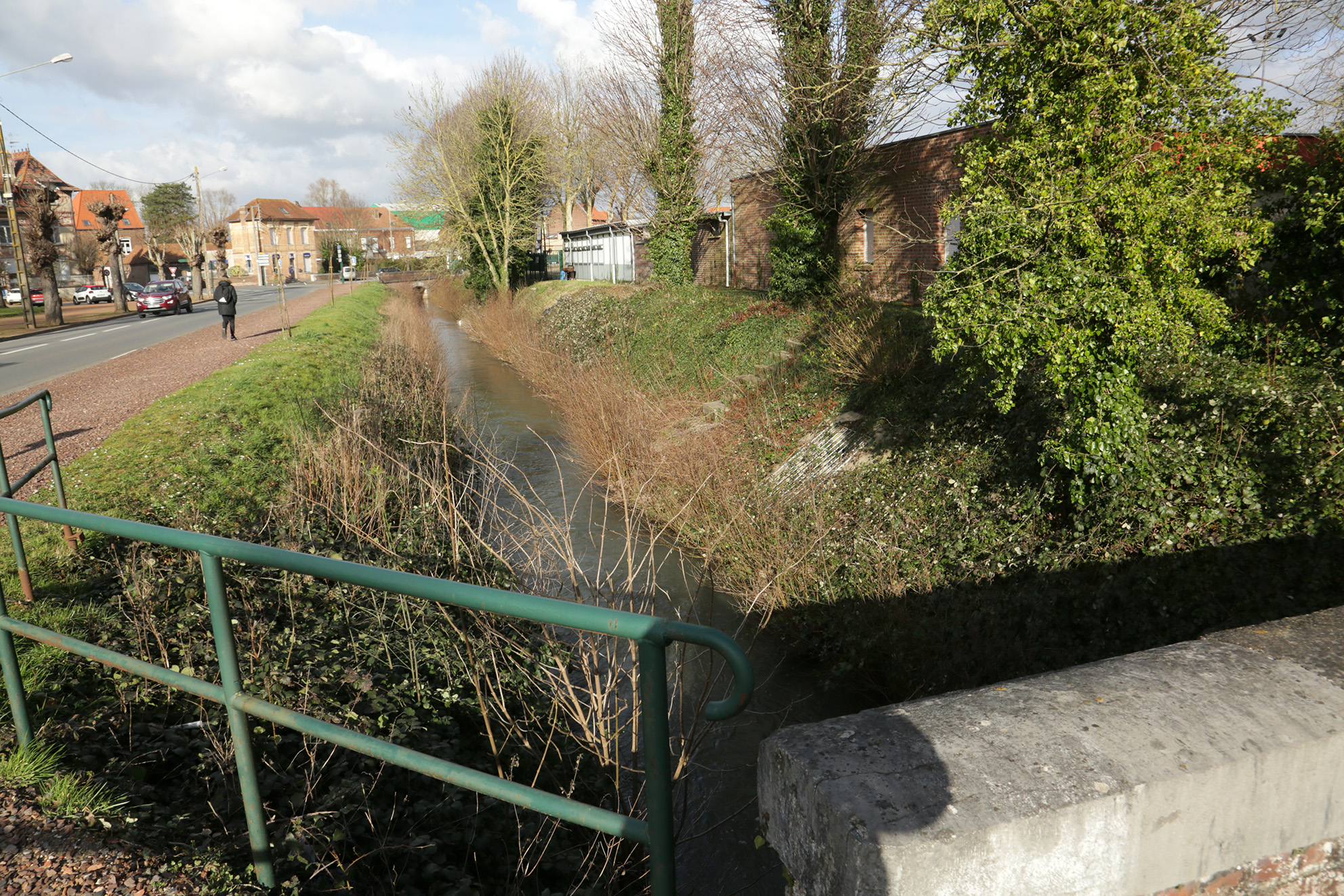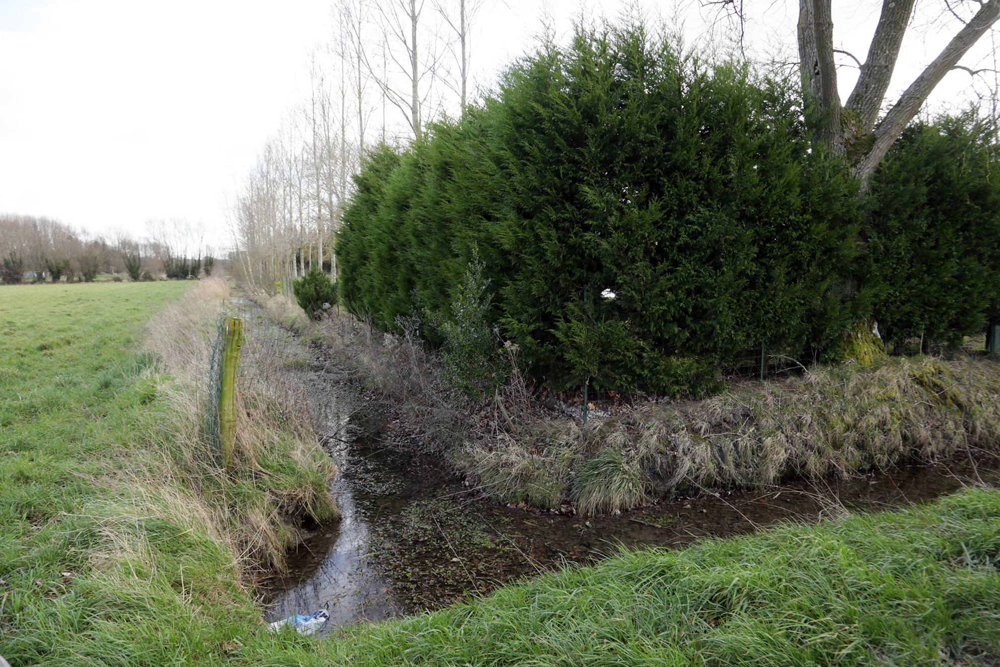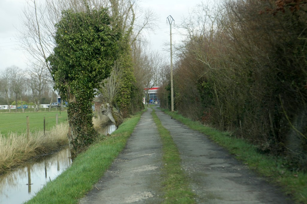 Direction Aire-sur-la-Lys, au fossé de dérivation de la Lacquette rejoignant la Laque, celui-ci longe la D943…