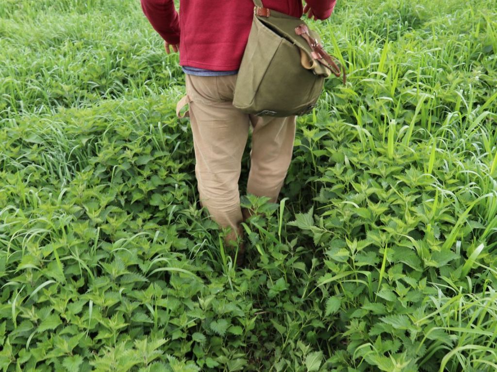 A la dernière maison, prendre à droite en longeant son mur, léchant le bord d’un champ… Pas très confortable. Nous entrons dans la campagne, un monde de champs et de prés… Nous découvrons les effets conjugués de la pluie et des températures du printemps : l’herbe a poussé drue !