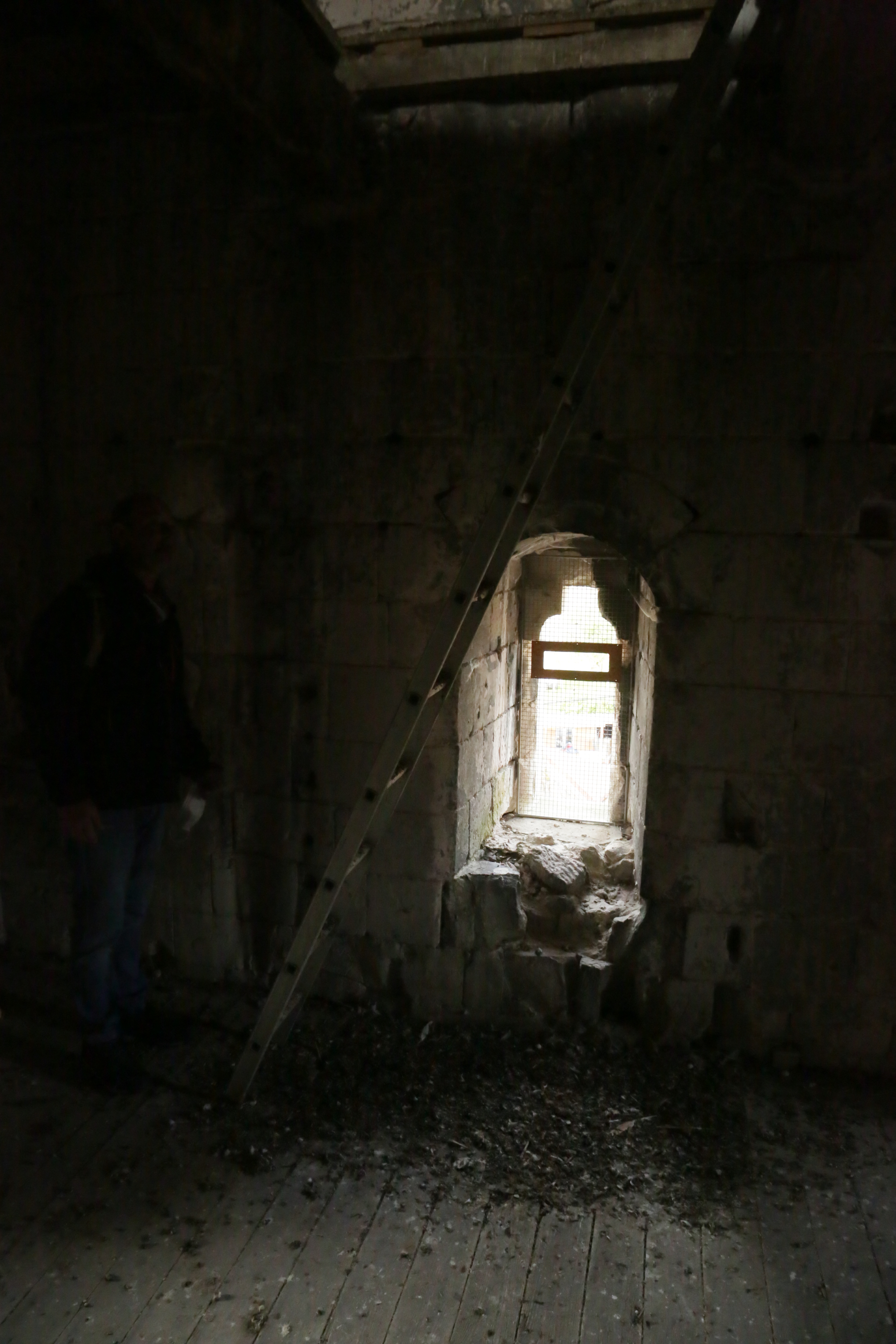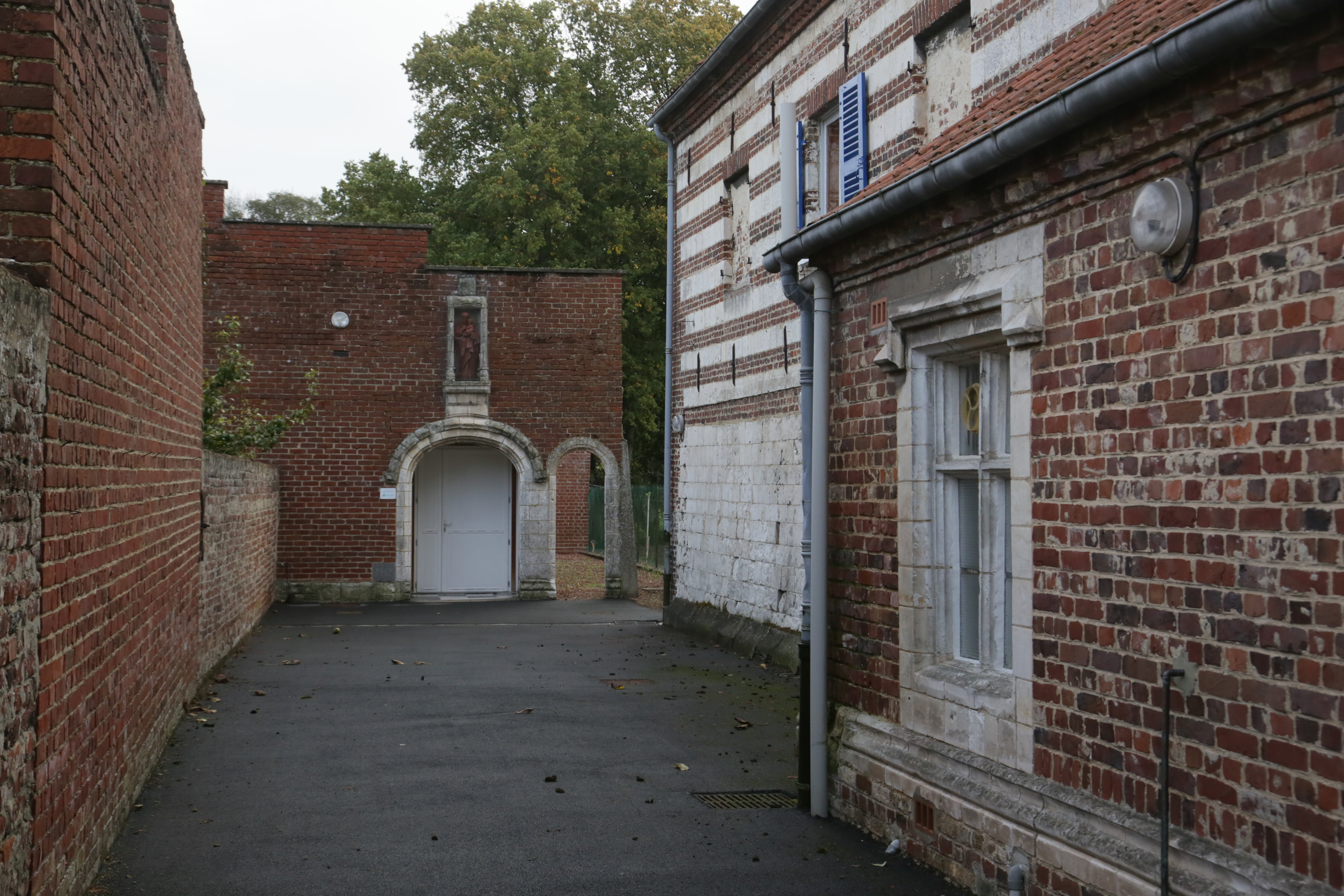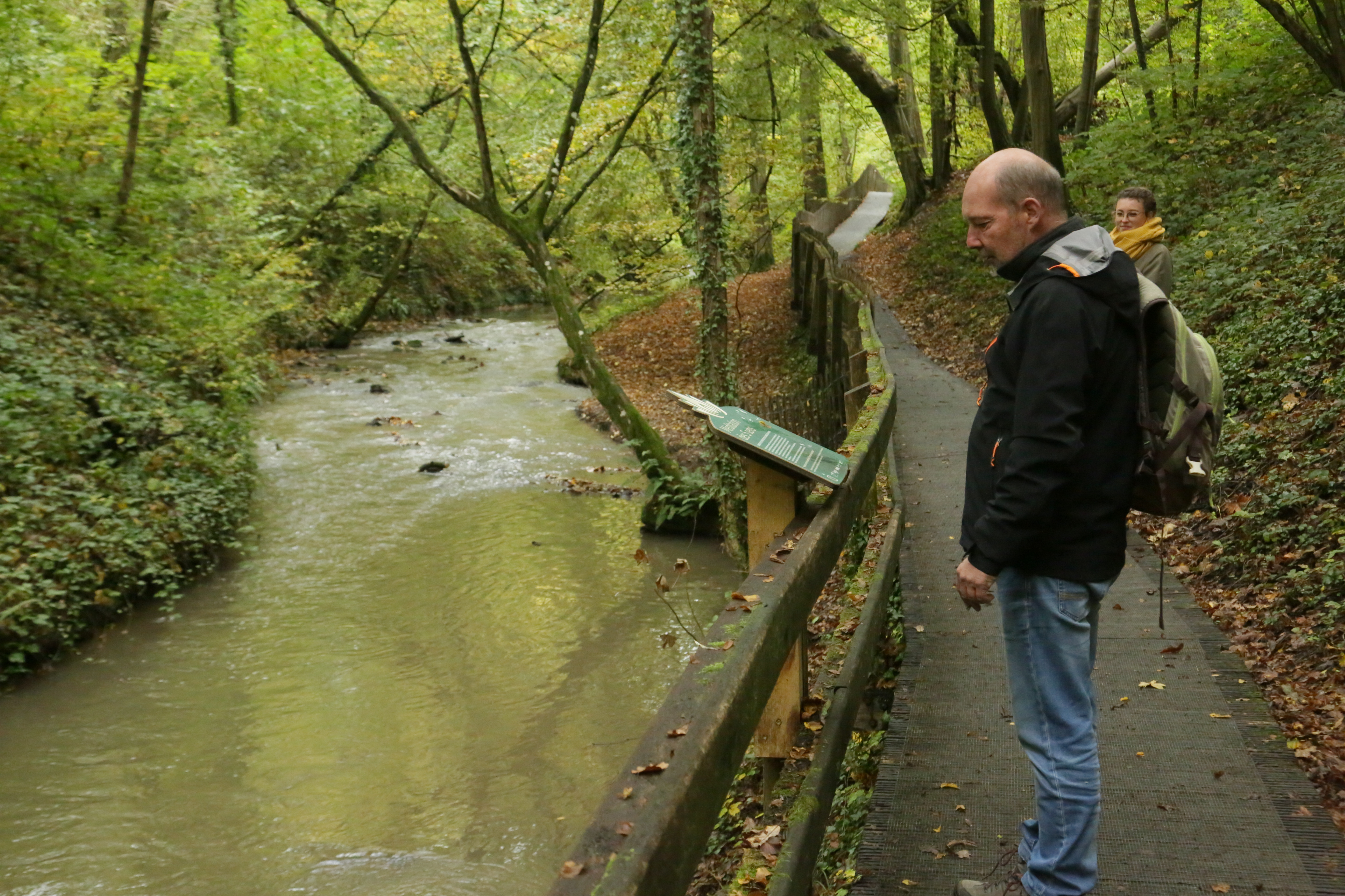 Avec Jérémie, nous scrutons le clocher pour essayer de comprendre, rien n’annonçait l’échec… 10h10, tant pis, on fait le tour de l’église, écoutons sagement les explications du technicien qui nous expose la situation de la rivière dans le village, masquée, canalisée comme nous l’avions vu fin août. Sommes bloqués devant un bâtiment qui sert de cantine aux écoliers, nous explique que la Lacquette est derrière, pas accessible, et juste visible sur une courte distance.