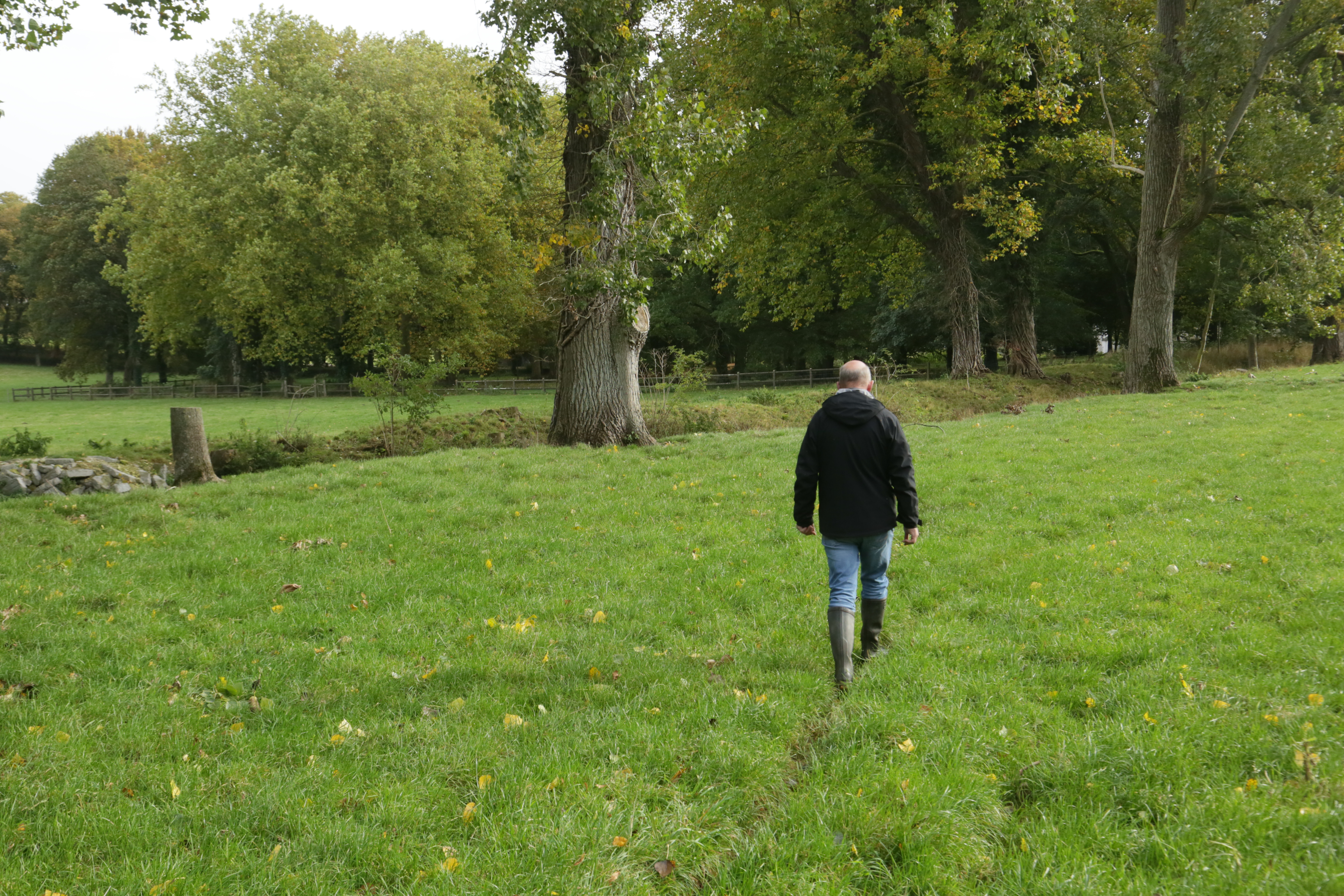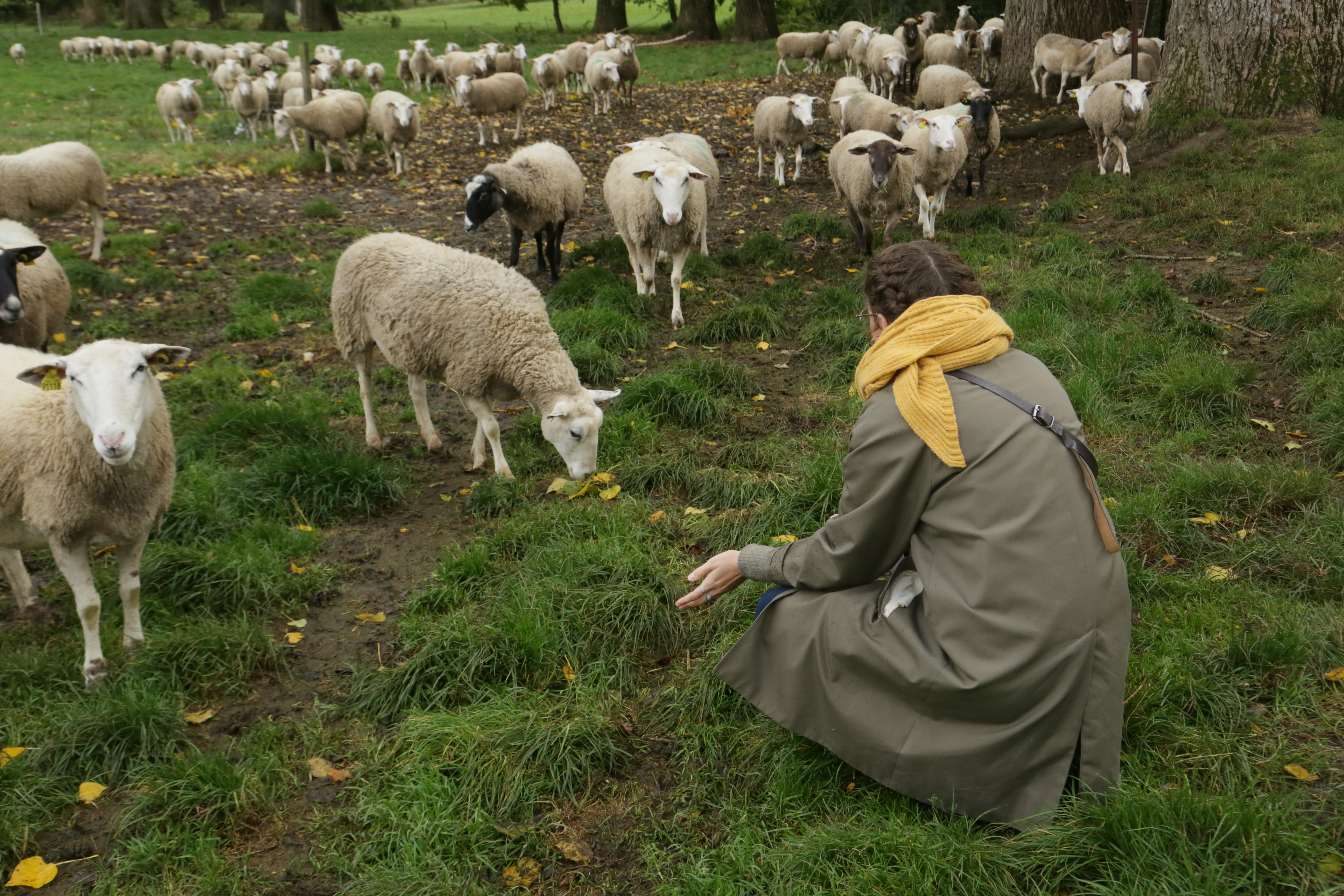 Sommes interrompus par l’arrivée d’un tracteur, l’éleveur nous accueille d’un franc sourire de bienvenue, nous nous présentons, s’appelle Rémy Hammeux ; il nous expose la situation de l’exploitation, son histoire même, familiale : l’achat progressif de la ferme, et des terres, une à une par le grand-père à l’ancien propriétaire du château. Je n’avais pas réalisé en arrivant que le fond de la prairie, c’est l’allée arborée du château de Créminil, celui même que nous avions arpentée avec Émilie et Samia fin août. Je ressens un certain plaisir, pouvoir assembler les pièces d’un puzzle : réaliser la continuité de la rivière.