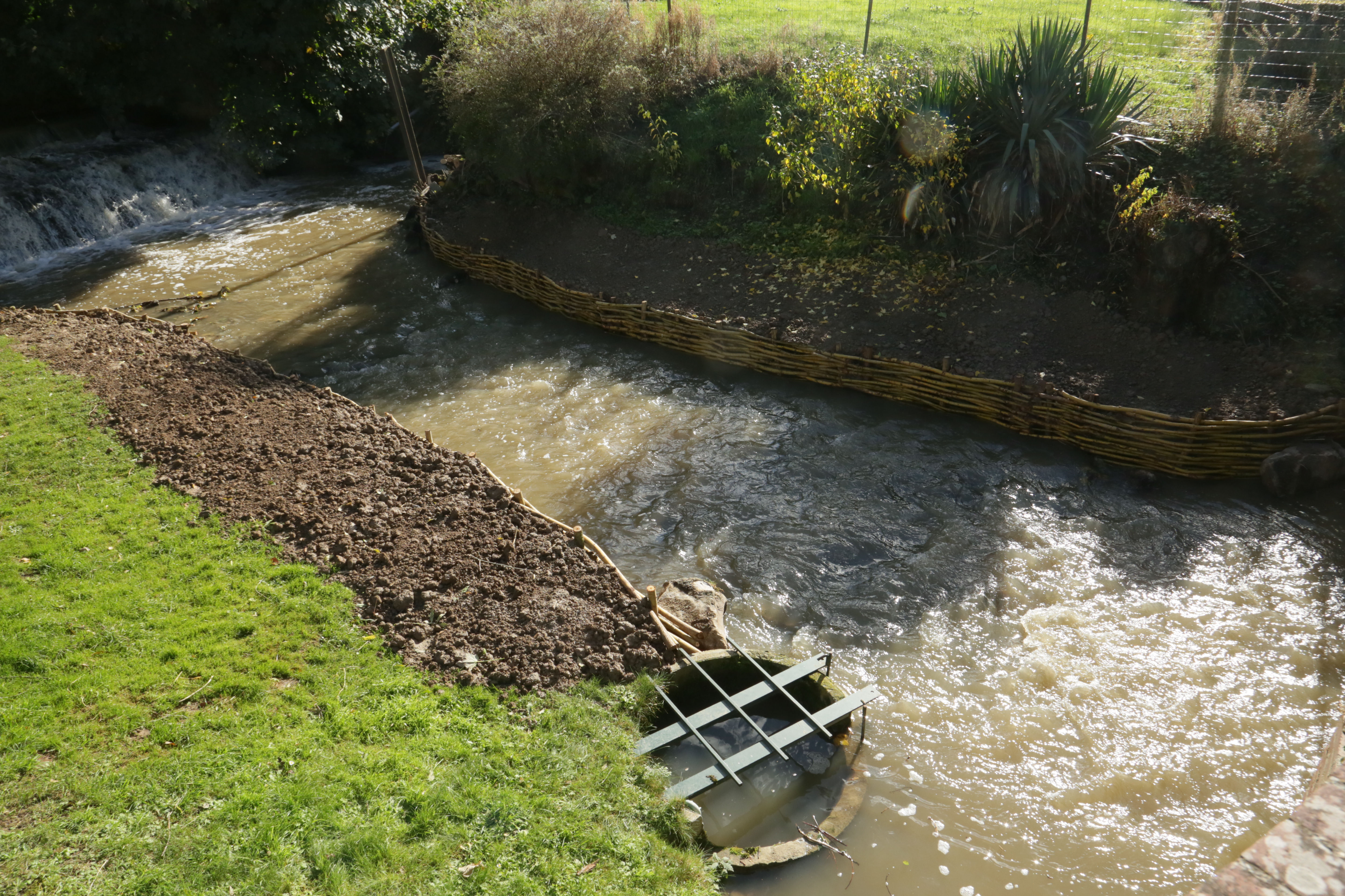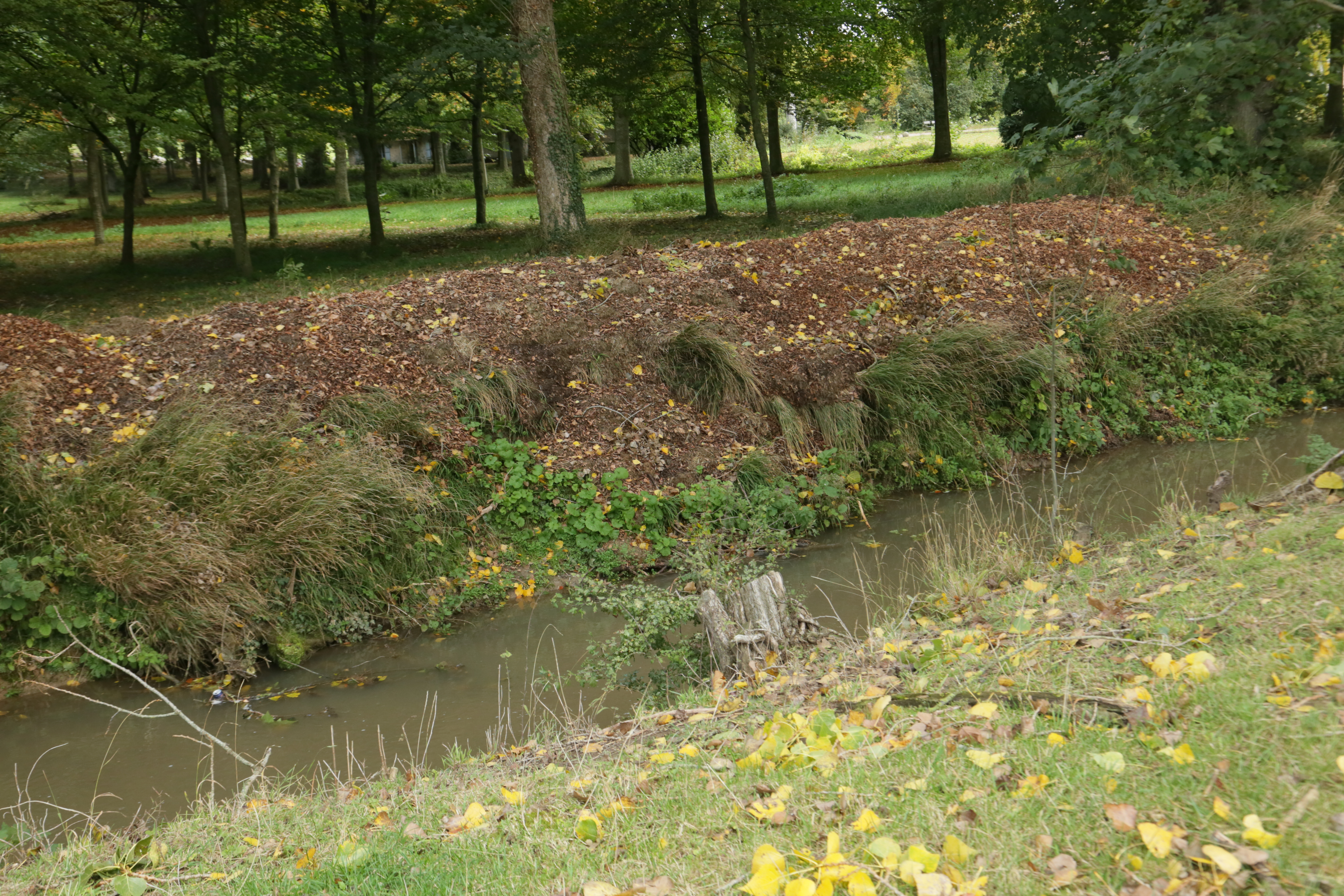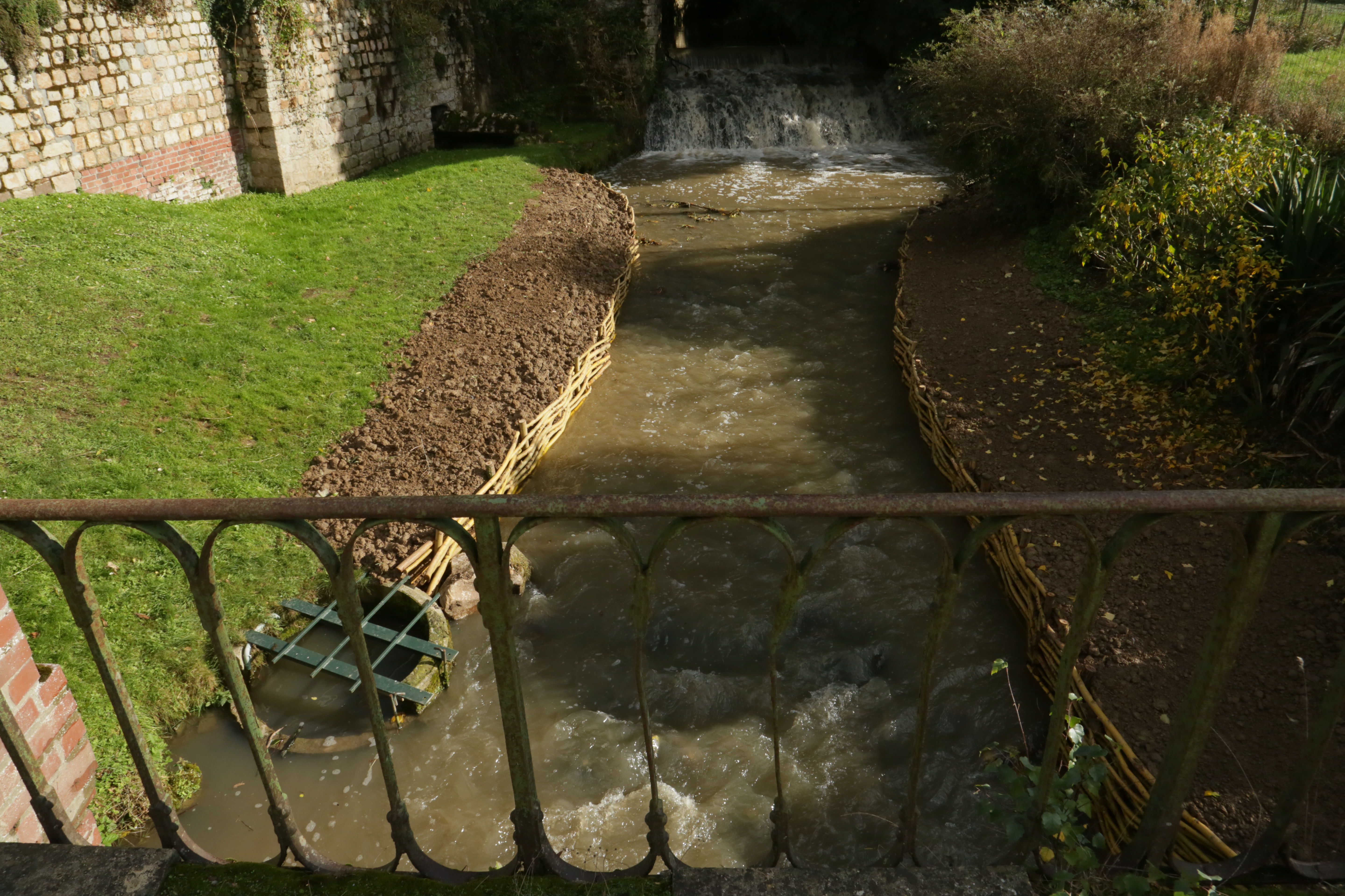 Nous repartons, c’est l’heure de la pause déjeuner, rendez-vous pris à Gauchin-Légal, au sud de la communauté d’agglomération. En chemin, nous nous arrêtons au niveau d’un moulin que nous avions déjà vu avec Émilie, Jérémie veut nous montrer là un exemple de restauration de berge. Effectivement celle-ci a changé, a été réalisé une amélioration de l’état physique des berges par clayonnage, avec des tiges de saule, restera à installer des plantes hélophytes qui vont coloniser… Nous dit que pour ce type d’aménagements, le génie végétal est assuré par la régie de la communauté d’agglomération.