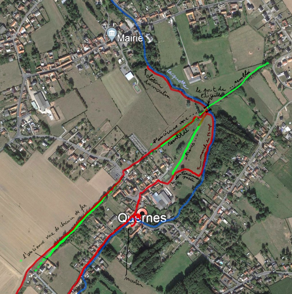 Embarquer un groupe à descendre au sud, depuis la mairie, le long de la Lacquette, jusqu’aux bassins de stockage des effluents autroroutiers de la SANEF et remonter pour tourner vers le village ; déboucher sur la Grande Rue, et poursuivre en direction du Cimetière, rue du Nocquet… puis à travers champ, jusqu’au pont de l’aiguille, et remonter jusqu’à la clôture du terrain du moulin de Witternesse, puis retourner jusqu’à la ferme de monsieur Labitte, toujours en longeant la Lacquette, et sortir sur la rue du Nocquet ; gagner le moulin de Quernes pour une halte avant de terminer à la mairie.